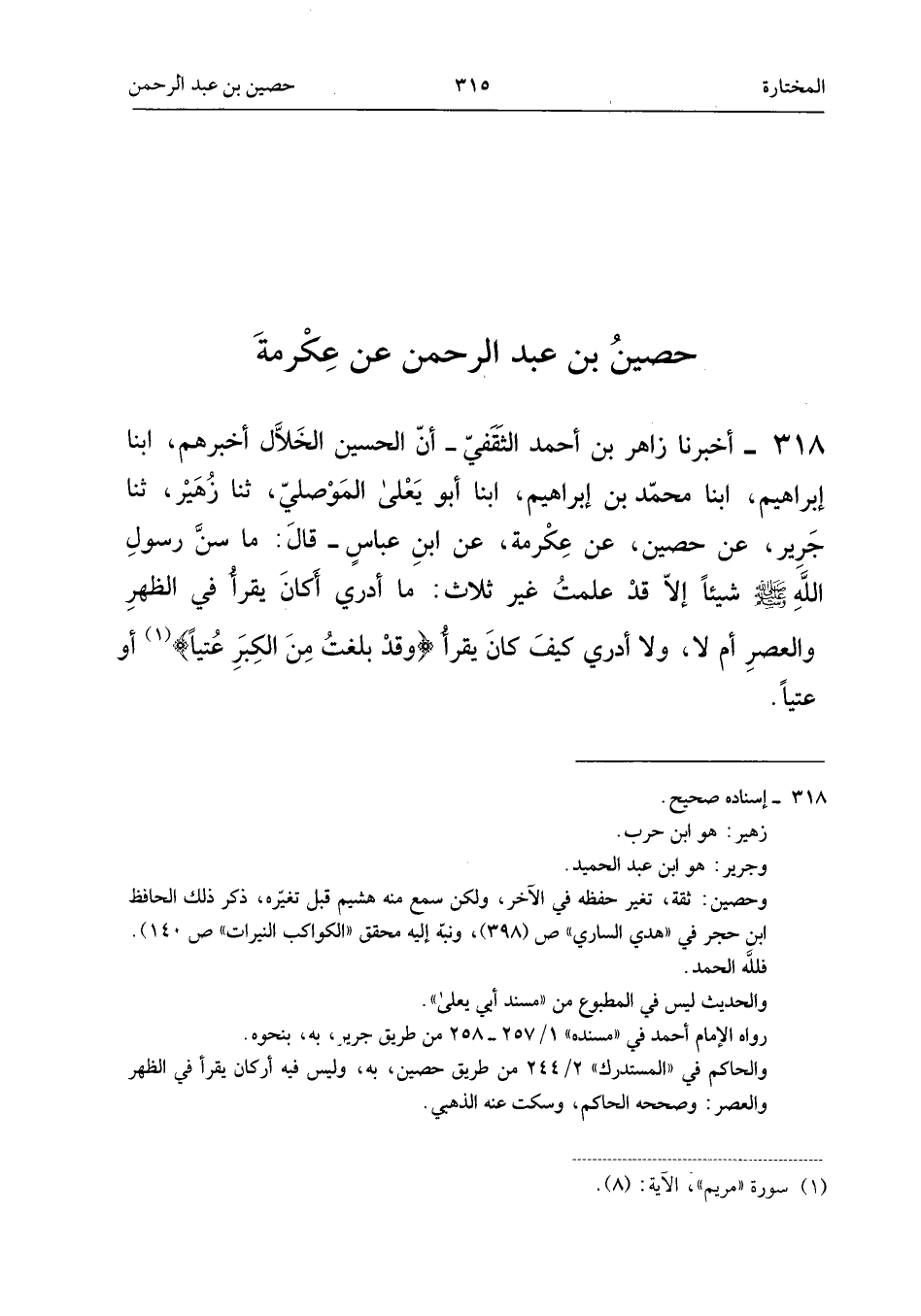 318 - أَخْبَرَنَا زَاهِرُ بْنُ أَحْمَدَ الثَّقَفِيُّ، أَنَّ الْحُسَيْنَ الْخَلالَ أَخْبَرَهُمْ، أبنا إِبْرَاهِيمُ، أبنا مُحَمَّدُ بْنُ إِبْرَاهِيمَ، أبنا أَبُو يَعْلَى الْمَوْصِلِيُّ، ثَنَا زُهَيْرٌ، ثَنَا جَرِيرٌ، عَنْ حُصَيْنٍ، عَنْ عِكْرِمَةَ، عَنِ ابْن عَبَّاس، قَالَ: مَا سَنَّ رَسُولُ اللَّهِ صَلَّى اللَّهُ عَلَيْهِ وَسَلَّمَ شَيْئًا إِلا قَدْ عَلِمْتُ غَيْرَ ثَلاثٍ: مَا أَدْرِي أَكَانَ يَقْرَأُ فِي الظُّهْرِ وَالْعَصْرِ أَمْ لَا، وَلا أَدْرِي كَيْفَ كَانَ يَقْرَأُ وَقَدْ بَلَغْتُ مِنَ الْكِبَرِ عُتِيًّا أَوْ عِتِيًّا.