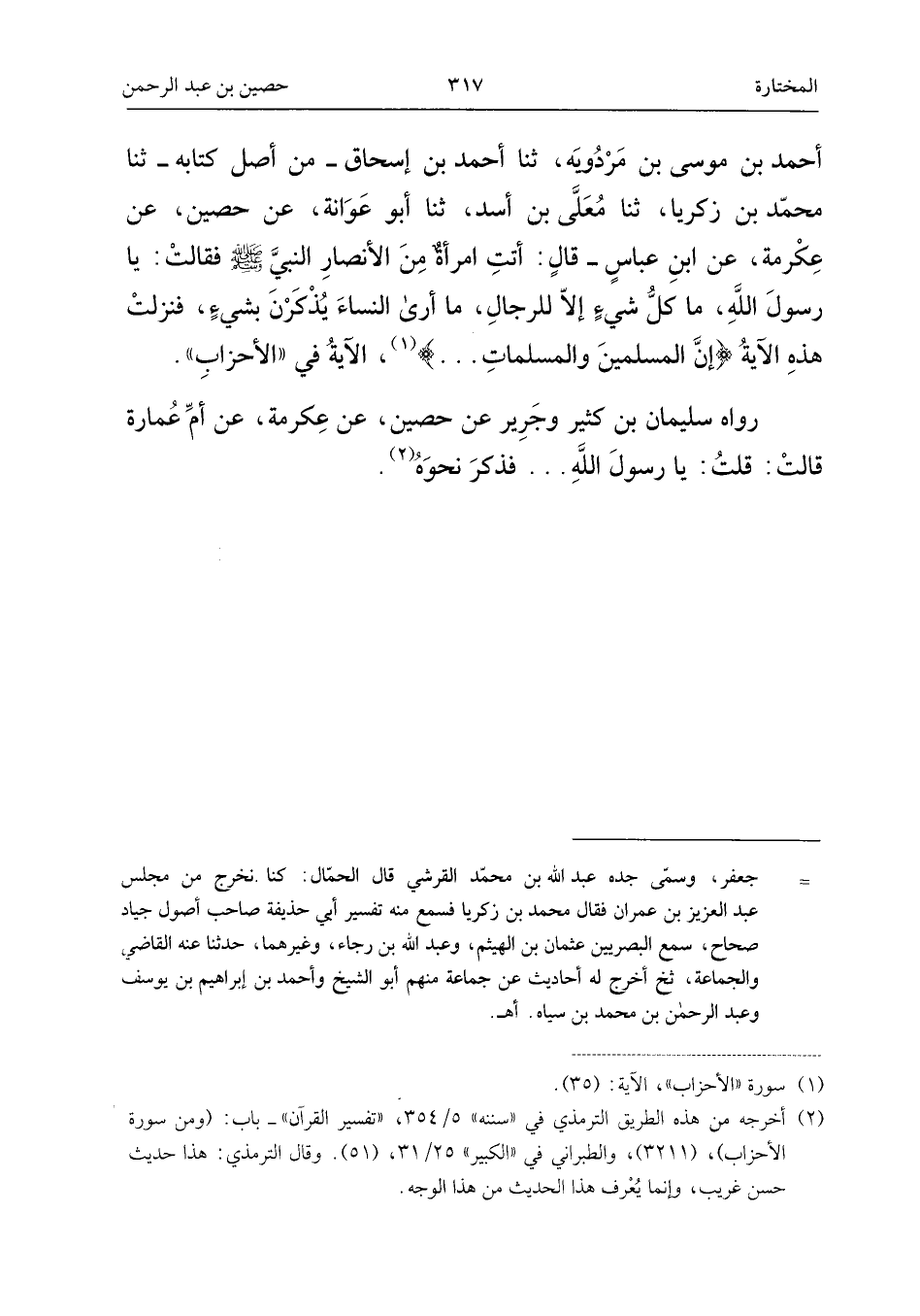أَحْمَدُ بْنُ مُوسَى بْنِ مَرْدُوَيْهِ، ثَنَا أَحْمَدُ بْنُ إِسْحَاقَ، مِنْ أَصْلِ كِتَابِهِ، ثَنَا مُحَمَّدُ بْنُ زَكَرِيَّا، ثَنَا مُعَلَّى بْنُ أَسَدٍ، ثَنَا أَبُو عَوَانَةَ، عَنْ حُصَيْنٍ، عَنْ عِكْرِمَةَ، عَنِ ابْن عَبَّاس، قَالَ: أَتَتِ امْرَأَةٌ مِنَ الأَنْصَارِ النَّبِيَّ صَلَّى اللَّهُ عَلَيْهِ وَسَلَّمَ فَقَالَتْ: يَا رَسُولَ اللَّهِ، مَا كُلُّ شَيْءٍ إِلا لِلرِّجَالِ، مَا أَرَى النِّسَاءَ يُذْكَرْنَ بِشَيْءٍ، فَنَزَلَتْ هَذِهِ الآيَةُ {إِنَّ الْمُسْلِمِينَ وَالْمُسْلِمَاتِ} [الْأَحْزَاب: 35] الآيَةُ فِي الأَحْزَابِ.