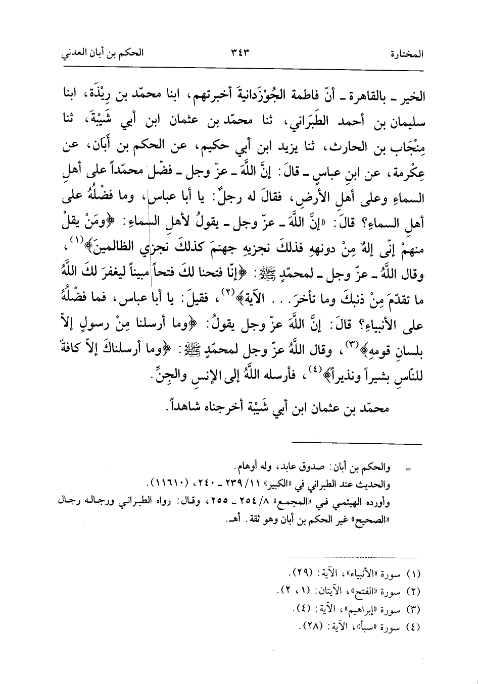 الْخَيْرِ، بِالْقَاهِرَةِ، أَنَّ فَاطِمَةَ الْجُوزْدَانِيَّةَ أَخْبَرَتْهُمْ، أبنا مُحَمَّدُ بْنُ رِيذَةَ، أبنا سُلَيْمَانُ بْنُ أَحْمَدَ الطَّبَرَانِيُّ، ثَنَا مُحَمَّدُ بْنُ عُثْمَانَ بْنِ أَبِي شَيْبَةَ، ثَنَا مِنْجَابُ بْنُ الْحَارِثِ، ثَنَا يَزِيدُ بْنُ أَبِي حَكِيمٍ، عَنِ الْحَكَمِ بْنِ أَبَانٍ، عَنْ عِكْرِمَةَ، عَنِ ابْن عَبَّاس، قَالَ: إِنَّ اللَّهَ، عَزَّ وَجَلَّ، فَضَّلَ مُحَمَّدا عَلَى أَهْلِ السَّمَاءِ وَعَلى أَهْلِ الأَرْضِ، فَقَالَ لَهُ رَجُلٌ: يَا أَبَا عَبَّاسٍ، وَمَا فَضْلُهُ عَلَى أَهْلِ السَّمَاءِ؟ قَالَ: " إِنَّ اللَّهَ، عَزَّ وَجَلَّ، يَقُولُ لأَهْلِ السَّمَاءِ: {وَمَنْ يَقُلْ مِنْهُمْ إِنِّي إِلَهٌ مِنْ دُونِهِ فَذَلِكَ نَجْزِيهِ جَهَنَّمَ كَذَلِكَ نَجْزِي الظَّالِمِينَ} [الْأَنْبِيَاء: 29] ، وَقَالَ اللَّهُ، عَزَّ وَجَلَّ، لِمُحَمَّدٍ صَلَّى اللَّهُ عَلَيْهِ وَسَلَّمَ: {إِنَّا فَتَحْنَا لَكَ فَتْحًا مُبِينًا {1} لِيَغْفِرَ لَكَ اللَّهُ مَا تَقَدَّمَ مِنْ ذَنْبِكَ وَمَا تَأَخَّرَ} [الْفَتْح: 1-2] الْآيَة، فَقِيلَ: يَا أَبَا عَبَّاسٍ، فَمَا فَضْلُهُ عَلَى الأَنْبِيَاءِ؟ ، قَالَ: إِنَّ اللَّهَ عَزَّ وَجَلَّ، يَقُولُ: {وَمَا أَرْسَلْنَا مِنْ رَسُولٍ إِلا بِلِسَانِ قَوْمِهِ} [إِبْرَاهِيم: 4] وَقَالَ اللَّهُ عَزَّ وَجَلَّ لِمُحَمَّدٍ صَلَّى اللَّهُ عَلَيْهِ وَسَلَّمَ: {وَمَا أَرْسَلْنَاكَ إِلا كَافَّةً لِلنَّاسِ بَشِيرًا وَنَذِيرًا} [سبأ: 28] ، فَأَرْسَلَهُ اللَّهُ إِلَى الإِنْسِ وَالْجِنِّ.