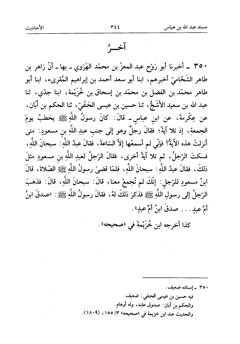 350 - أَخْبَرَنَا أَبُو رَوْحٍ عَبْدُ الْمُعِزِّ بْنُ مُحَمَّدٍ الْهَرَوِيُّ، بِهَا، أَنَّ زَاهِرَ بْنَ طَاهِرٍ الشَّحَّامِيَّ أَخْبَرَهُمْ، أبنا أَبُو سَعْدٍ أَحْمَدُ بْنُ إِبْرَاهِيمَ الْمُقْرِئُ، أبنا أَبُو طَاهِرٍ مُحَمَّدُ بْنُ الْفَضْلِ بْنِ مُحَمَّدِ بْنِ إِسْحَاقِ بْنِ خُزَيْمَةَ، أبنا جَدِّي، ثَنَا عَبْدُ اللَّهِ بْنُ سَعِيدٍ الأَشَجُّ، ثَنَا حُسَيْنُ بْنُ عِيسَى الْحَنَفِيُّ، ثَنَا الْحَكَمُ بْنُ أَبَانٍ، عَنْ عِكْرِمَةَ، عَنِ ابْن عَبَّاس، قَالَ: كَانَ رَسُولُ اللَّهِ صَلَّى اللَّهُ عَلَيْهِ وَسَلَّمَ يَخْطُبُ يَوْمَ الْجُمُعَةِ، إِذْ تَلا آيَةً، فَقَالَ رَجُلٌ وَهُوَ إِلَى جَنْبِ عَبْدِ اللَّهِ بْنِ مَسْعُودٍ: مَتَى أُنْزِلَتْ هَذِهِ الآيَةُ؟ فَإِنِّي لَمْ أَسْمَعْهَا إِلا السَّاعَةَ، فَقَالَ عَبْدُ اللَّهِ: سُبْحَانَ اللَّهِ، فَسَكَتَ الرَّجُلُ، ثُمَّ تَلا آيَةً أُخْرَى، فَقَالَ الرَّجُلُ لِعَبْدِ اللَّهِ بْنِ مَسْعُودٍ مِثْلَ ذَلِكَ، فَقَالَ عَبْدُ اللَّهِ: سُبْحَانَ اللَّهِ، فَلَمَّا قَضَى رَسُولُ اللَّهِ صَلَّى اللَّهُ عَلَيْهِ وَسَلَّمَ الصَّلاةَ، قَالَ ابْنُ مَسْعُودٍ لِلرَّجُلِ: إِنَّكَ لَمْ تَجْمَعْ مَعَنَا، قَالَ: سُبْحَانَ اللَّهِ، قَالَ: فَذَهَبَ الرَّجُلُ إِلَى رَسُولِ اللَّهِ صَلَّى اللَّهُ عَلَيْهِ وَسَلَّمَ فَذَكَرَ ذَلِكَ لَهُ، فَقَالَ رَسُولُ اللَّهِ صَلَّى اللَّهُ عَلَيْهِ وَسَلَّمَ: «صَدَقَ ابْنُ أُمِّ عَبْدٍ. . . صَدَقَ ابْنُ أُمِّ عَبْدٍ» ، كَذَا أَخْرَجَهُ ابْنُ خُزَيْمَةَ فِي صَحِيحِهِ