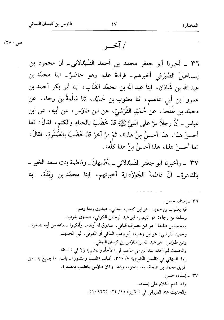 36 - أَخْبَرَنَا أَبُو جَعْفَرٍ مُحَمَّدُ بْنُ أَحْمَدَ الصَّيْدَلانِيُّ، أَنَّ مَحْمُودَ بْنَ إِسْمَاعِيلَ الصَّيْرَفِيَّ أَخْبَرَهُمْ، قِرَاءَةً عَلَيْهِ وَهُوَ حَاضِرٌ، أبنا مُحَمَّدُ بْنُ عَبْدِ اللَّهِ بْنِ شَاذَانَ، أبنا عَبْدُ اللَّهِ بْنُ مُحَمَّدٍ الْقَبَّابُ، أبنا أَبُو بَكْرٍ أَحْمَدُ بْنُ عَمْرِو بْنِ أَبِي عَاصِمٍ، ثَنَا يَعْقُوبُ بْنُ حُمَيْدٍ، ثَنَا سَلَمَةُ بْنُ رَجَاءٍ، عَنْ مُحَمَّدِ بْنِ طَلْحَةَ، عَنْ حُمَيْدٍ الْقُرَشِيِّ، عَنِ ابْنِ طَاوُسٍ، عَنْ أَبِيهِ، عَنِ ابْن عَبَّاس، أَنَّ رَجُلا مَرَّ عَلَى النَّبِيِّ صَلَّى اللَّهُ عَلَيْهِ وَسَلَّمَ قَدْ خَضَبَ بِالْحِنَّاءِ وَالْكَتَمِ، فَقَالَ: «مَا أَحْسَنَ هَذَا، هَذَا أَحْسَنُ مِنْ هَذَا» ، ثُمَّ مَرَّ آخَرُ قَدْ خَضَبَ بِالصُّفْرَةِ، فَقَالَ: «مَا أَحْسَنَ هَذَا، هَذَا أَحْسَنُ مِنْ هَذَا كُلِّهِ»