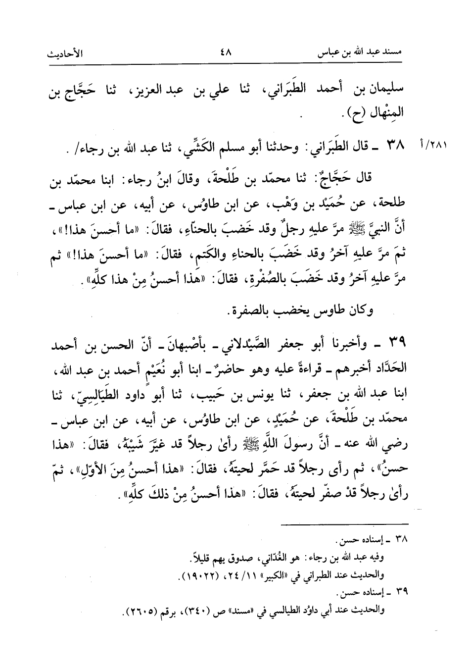 38 - قَالَ الطَّبَرَانِيُّ: وَحَدَّثَنَا أَبُو مُسْلِمٍ الْكَشِّيُّ، ثَنَا عَبْدُ اللَّهِ بْنُ رَجَاءٍ، قَالَ حَجَّاجٌ: ثَنَا مُحَمَّدُ بْنُ طَلْحَةَ، وَقَالَ ابْنُ رَجَاءٍ: أبنا مُحَمَّدُ بْنُ طَلْحَةَ، عَنْ حُمَيْدِ بْنِ وَهْبٍ، عَنِ ابْنِ طَاوُسٍ، عَنْ أَبِيهِ، عَنِ ابْن عَبَّاس، أَنَّ النَّبِيَّ صَلَّى اللَّهُ عَلَيْهِ وَسَلَّمَ مَرَّ عَلَيْهِ رَجُلٌ وَقَدْ خَضَبَ بِالْحِنَّاءِ، فَقَالَ: «مَا أَحْسَنَ هَذَا!» ثُمَّ مَرَّ عَلَيْهِ آخَرُ وَقَدْ خَضَبَ بِالْحِنَّاءِ وَالْكَتَمِ، فَقَالَ: «مَا أَحْسَنَ هَذَا!» ثُمَّ مَرَّ عَلَيْهِ آخَرُ وَقَدْ خَضَبَ بِالصُّفْرَةِ، فَقَالَ: «هَذَا أَحْسَنُ مِنْ هَذَا كُلِّهِ» ، وَكَانَ طَاوُسٌ يَخْضِبُ بِالصُّفْرَةِ