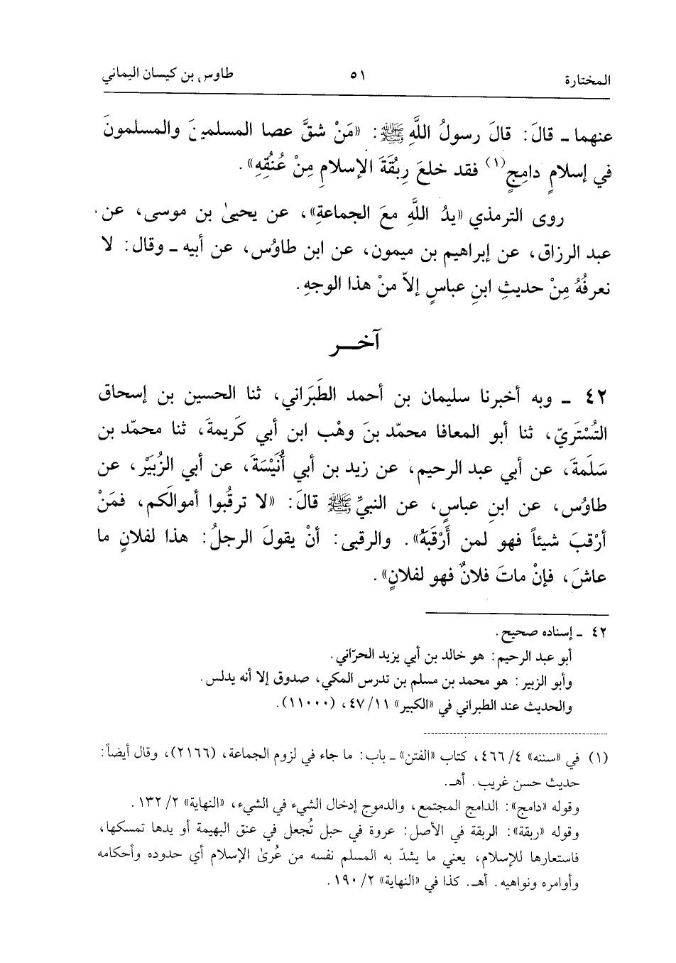 42 - وَبِهِ أَخْبَرَنَا سُلَيْمَانُ بْنُ أَحْمَدَ الطَّبَرَانِيُّ، ثَنَا الْحُسَيْنُ بْنُ إِسْحَاقَ التُّسْتَرِيُّ، ثَنَا أَبُو الْمُعَافَى مُحَمَّدُ بْنُ وَهْبِ بْنِ أَبِي كَرِيمَةَ، ثَنَا مُحَمَّدُ بْنُ سَلَمَةَ، عَنْ أَبِي عَبْدِ الرَّحِيمِ، عَنْ زَيْدِ بْنِ أَبِي أُنَيْسَةَ، عَنْ أَبِي الزُّبَيْرِ، عَنْ طَاوُسٍ، عَنِ ابْن عَبَّاس، عَنِ النَّبِيِّ صَلَّى اللَّهُ عَلَيْهِ وَسَلَّمَ قَالَ: «لَا تُرْقِبُوا أَمْوَالَكُمْ، فَمَنْ أَرْقَبَ شَيْئًا فَهُوَ لِمَنْ أَرْقَبَهُ» ، وَالرُّقْبَى: أَنْ يَقُولَ الرَّجُلُ: هَذَا لِفُلانٍ مَا عَاشَ، فَإِنْ مَاتَ فُلانٌ فَهُوَ لِفُلانٍ.