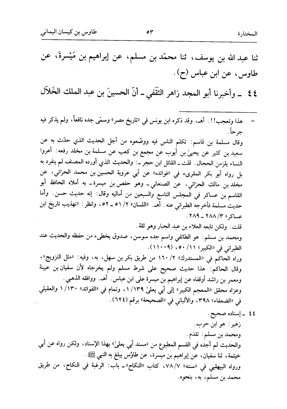 44 - وَأَخْبَرَنَا أَبُو الْمَجْدِ زَاهِرٌ الثَّقَفِيُّ، أَنَّ الْحُسَيْنَ بْنَ عَبْدِ الْمَلِكِ الْخَلالَ