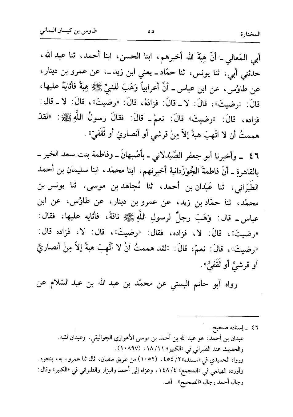 46 - وَأَخْبَرَنَا أَبُو جَعْفَرٍ الصَّيْدَلانِيُّ، بِأَصْبَهَانَ، وَفَاطِمَةُ بِنْتُ سَعْدٍ الْخَيْرِ، بِالْقَاهِرَةِ، أَنَّ فَاطِمَةَ الْجُوزْدَانِيَّةَ أَخْبَرَتْهُمْ، أبنا مُحَمَّدٌ، أبنا سُلَيْمَانُ بْنُ أَحْمَدَ الطَّبَرَانِيُّ، ثَنَا عَبْدَانُ بْنُ أَحْمَدَ، ثَنَا مُجَاهِدُ بْنُ مُوسَى، ثَنَا يُونُسُ بْنُ مُحَمَّدٍ، ثَنَا حَمَّادُ بْنُ زَيْدٍ، عَنْ عَمْرِو بْنِ دِينَارٍ، عَنْ طَاوُسٍ، عَنِ ابْن عَبَّاس، قَالَ: وَهَبَ رَجُلٌ لِرَسُولِ اللَّهِ صَلَّى اللَّهُ عَلَيْهِ وَسَلَّمَ نَاقَةً، فَأَثَابَهُ عَلَيْهَا، فَقَالَ: «رَضِيتَ» ، قَالَ: لَا، فَزَادَهُ، فَقَالَ: «رَضِيتَ» ، قَالَ: لَا، فَزَادَهُ، قَالَ: «رَضِيتَ» ، قَالَ: نَعَمْ، قَالَ: «لَقَدْ هَمَمْتُ أَنْ لَا أَتَّهِبَ هِبَةً إِلا مِنْ أَنْصَارِيٍّ، أَوْ قُرَشِيٍّ، أَوْ ثَقَفِيٍّ» ، رَوَاهُ أَبُو حَاتِمٍ الْبُسْتِيُّ، عَنْ مُحَمَّدِ بْنِ عَبْدِ اللَّهِ بْنِ عَبْدِ السَّلامِ، عَنْ