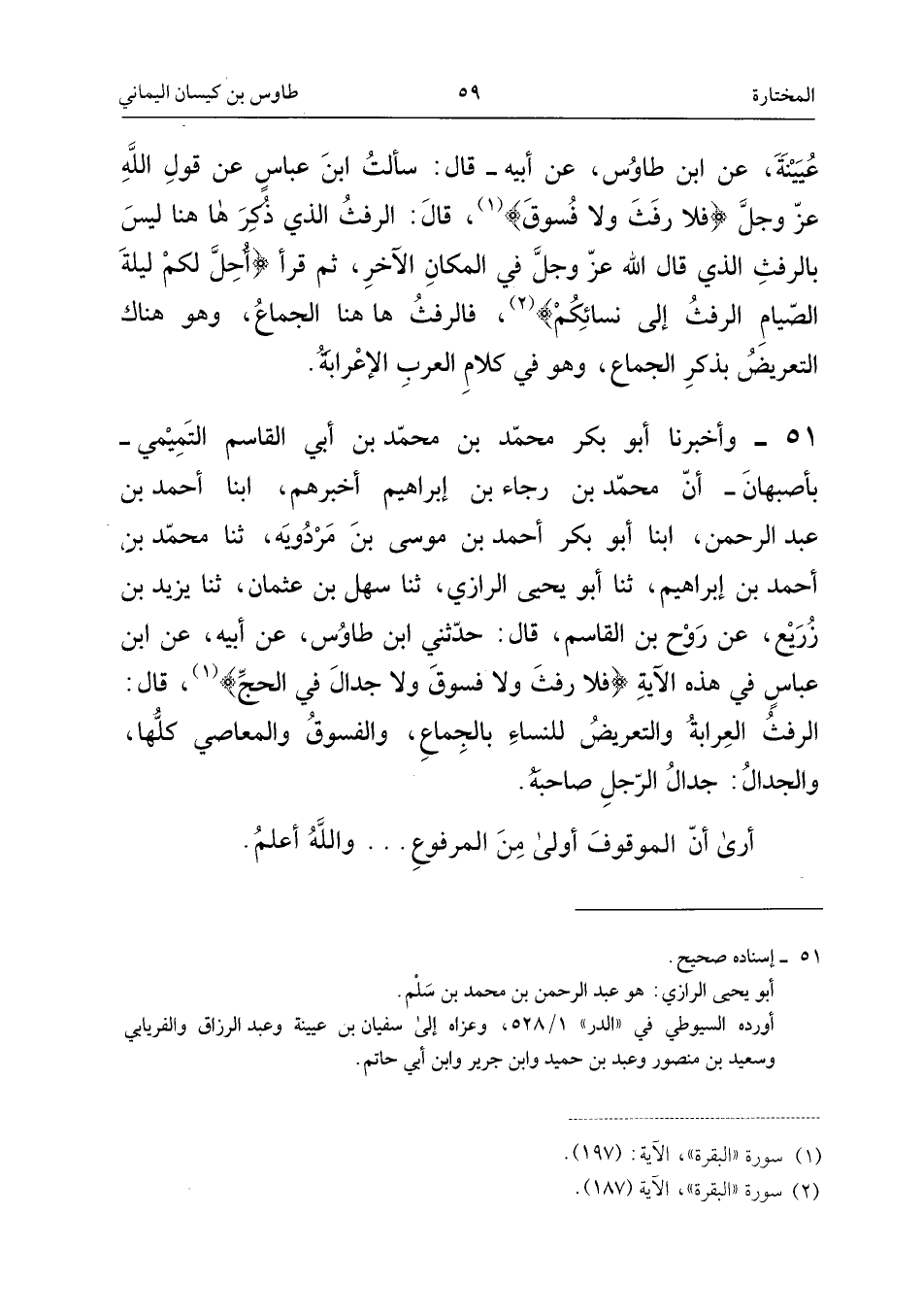 51 - وَأَخْبَرَنَا أَبُو بَكْرٍ مُحَمَّدُ بْنُ مُحَمَّدِ بْنِ أَبِي الْقَاسِمِ التَّمِيمِيُّ، بِأَصْبَهَانَ، أَنَّ مُحَمَّدَ بْنَ رَجَاءِ بْنِ إِبْرَاهِيمَ أَخْبَرَهُمْ، أبنا أَحْمَدُ بْنُ عَبْدِ الرَّحْمَنِ، أبنا أَبُو بَكْرٍ أَحْمَدُ بْنُ مُوسَى بْنِ مَرْدُوَيْهِ، ثَنَا مُحَمَّدُ بْنُ أَحْمَدَ بْنِ إِبْرَاهِيمَ، ثَنَا أَبُو يَحْيَى الرَّازِيُّ، ثَنَا سَهْلُ بْنُ عُثْمَانَ، ثَنَا يَزِيدُ بْنُ زُرَيْعٍ، عَنْ رَوْحِ بْنِ الْقَاسِمِ، قَالَ: حَدَّثَنِي ابْنُ طَاوُسٍ، عَنْ أَبِيهِ، عَنِ ابْن عَبَّاس فِي هَذِهِ الآيَةِ {فَلا رَفَثَ وَلا فُسُوقَ وَلا جِدَالَ فِي الْحَجِّ} [الْبَقَرَة: 197] ، قَالَ: الرَّفَثُ: الإِعْرَابَةُ، وَالتَّعْرِيضُ لِلنِّسَاءِ بِالْجِمَاعِ، وَالْفُسُوقُ وَالْمَعَاصِي كُلُّهَا، وَالْجِدَالُ: جِدَالُ الرَّجُلِ صَاحِبَهُ.