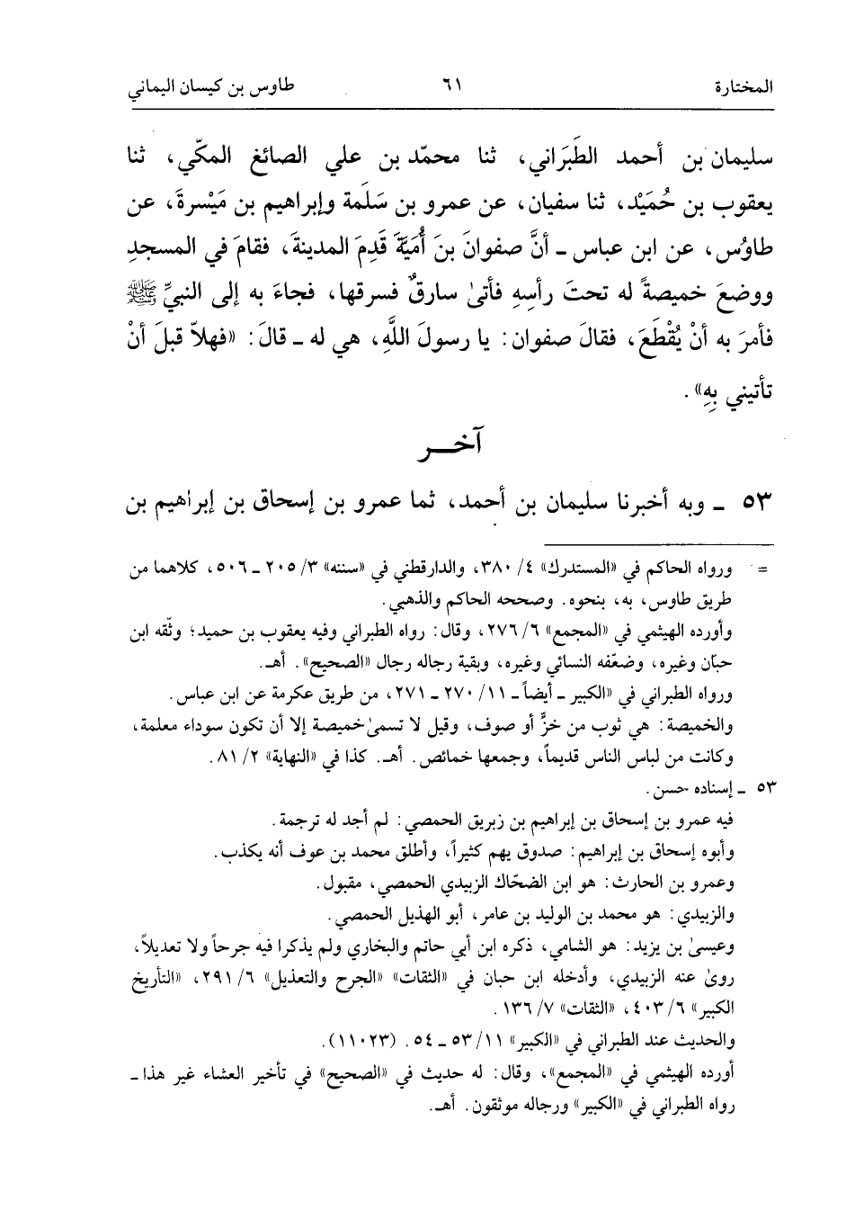 سُلَيْمَانُ بْنُ أَحْمَدَ الطَّبَرَانِيُّ، ثَنَا مُحَمَّدُ بْنُ عَلِيٍّ الصَّائِغُ الْمَكِّيُّ، ثَنَا يَعْقُوبُ بْنُ حُمَيْدٍ، ثَنَا سُفْيَانُ، عَنْ عَمْرِو بْنِ سَلَمَةَ، وَإِبْرَاهِيمَ بْنِ مَيْسَرَةَ، عَنْ طَاوُسٍ، عَنِ ابْن عَبَّاس، أَنَّ صَفْوَانَ بْنَ أُمَيَّةَ قَدِمَ الْمَدِينَةَ، فَقَامَ فِي الْمَسْجِدِ، وَوَضَعَ خَمِيصَةً لَهُ تَحْتَ رَأْسِهِ فَأَتَى سَارِقٌ فَسَرَقَهَا، فَجَاءَ بِهِ إِلَى النَّبِيِّ صَلَّى اللَّهُ عَلَيْهِ وَسَلَّمَ فَأَمَرَ بِهِ أَنْ يُقْطَعَ، فَقَالَ صَفْوَانُ: يَا رَسُولَ اللَّهِ، هِيَ لَهُ، قَالَ: «فَهَلا قَبْلَ أَنْ تَأْتِيَنِي بِهِ»