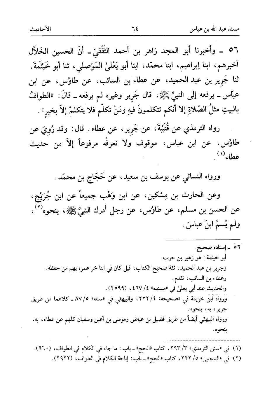 56 - وَأَخْبَرَنَا أَبُو الْمَجْدِ زَاهِرُ بْنُ أَحْمَدَ الثَّقَفِيُّ، أَنَّ الْحُسَيْنَ الْخَلالَ أَخْبَرَهُمْ، أبنا إِبْرَاهِيمُ، أبنا مُحَمَّدٌ، أبنا أَبُو يَعْلَى الْمَوْصِلِيُّ، ثَنَا أَبُو خَيْثَمَةَ، ثَنَا جَرِيرُ بْنُ عَبْدِ الْحَمِيدِ، عَنْ عَطَاءِ بْنِ السَّائِبِ، عَنْ طَاوُسٍ، عَنِ ابْن عَبَّاس، يَرْفَعُهُ إِلَى النَّبِيِّ صَلَّى اللَّهُ عَلَيْهِ وَسَلَّمَ، قَالَ جَرِيرٌ وَغَيْرُهُ: لَمْ يَرْفَعْهُ، قَالَ: «الطَّوَافُ بِالْبَيْتِ مِثْلَ الصَّلاةِ إِلا أَنَّكُمْ تَتَكَلَّمُونَ فِيهِ، وَمَنْ تَكَلَّمَ فَلا يَتَكَلَّمُ إِلا بِخَيْرٍ» .