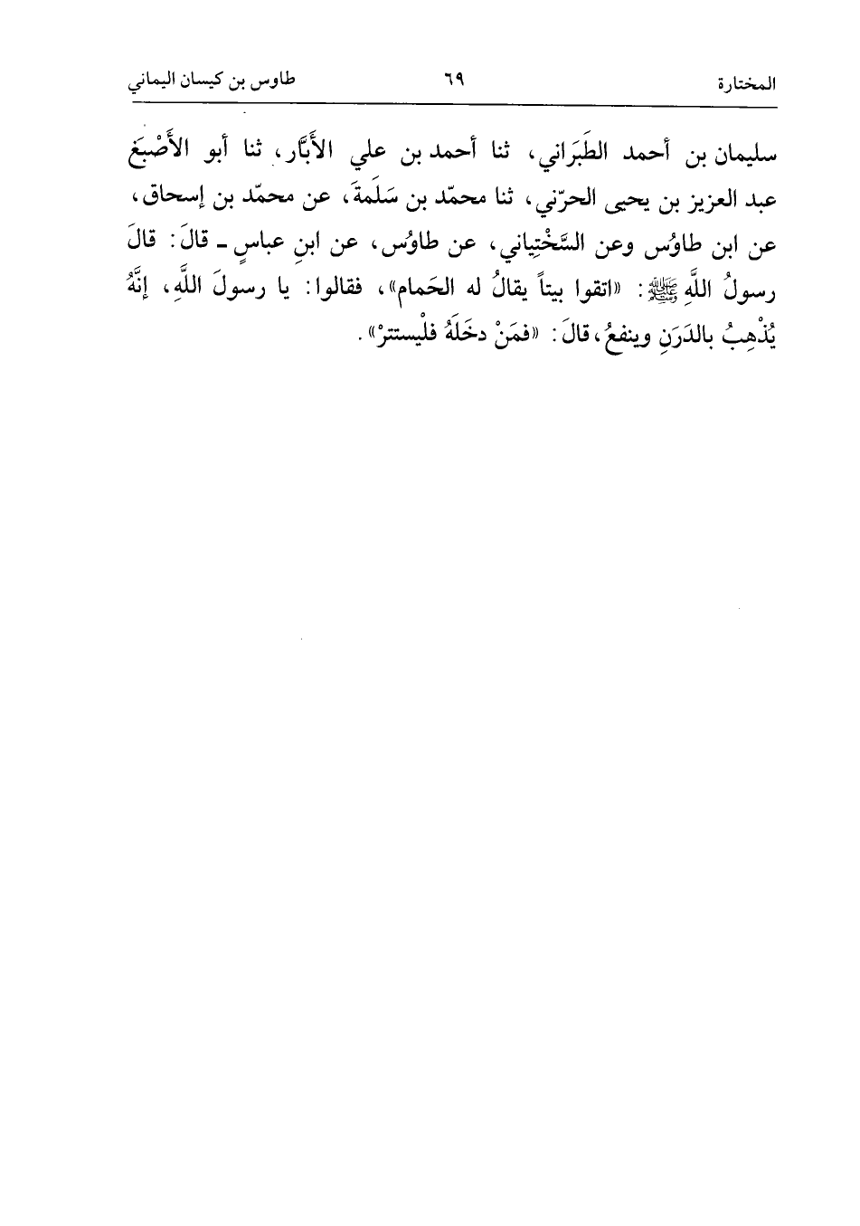 سُلَيْمَانُ بْنُ أَحْمَدَ الطَّبَرَانِيُّ، ثَنَا أَحْمَدُ بْنُ عَلِيٍّ الأَبَّارُ، ثَنَا أَبُو الأَصْبَغِ عَبْدُ الْعَزِيزِ بْنُ يَحْيَى الْحَرَّانِيُّ، ثَنَا مُحَمَّدُ بْنُ سَلَمَةَ، عَنْ مُحَمَّدِ بْنِ إِسْحَاقَ، عَنِ ابْنِ طَاوُسٍ، وَعَنِ السَّخْتِيَانِيِّ، عَنْ طَاوُسٍ، عَنِ ابْن عَبَّاس، قَالَ: قَالَ رَسُولُ اللَّهِ صَلَّى اللَّهُ عَلَيْهِ وَسَلَّمَ: «اتَّقُوا بَيْتًا يُقَالُ لَهُ الْحَمَّامُ» ، فَقَالُوا: يَا رَسُولَ اللَّهِ، إِنَّهُ يُذْهِبُ بِالدَّرَنِ وَيَنْفَعُ، قَالَ: «فَمَنْ دَخَلَهُ فَلْيَسْتَتِرْ»
