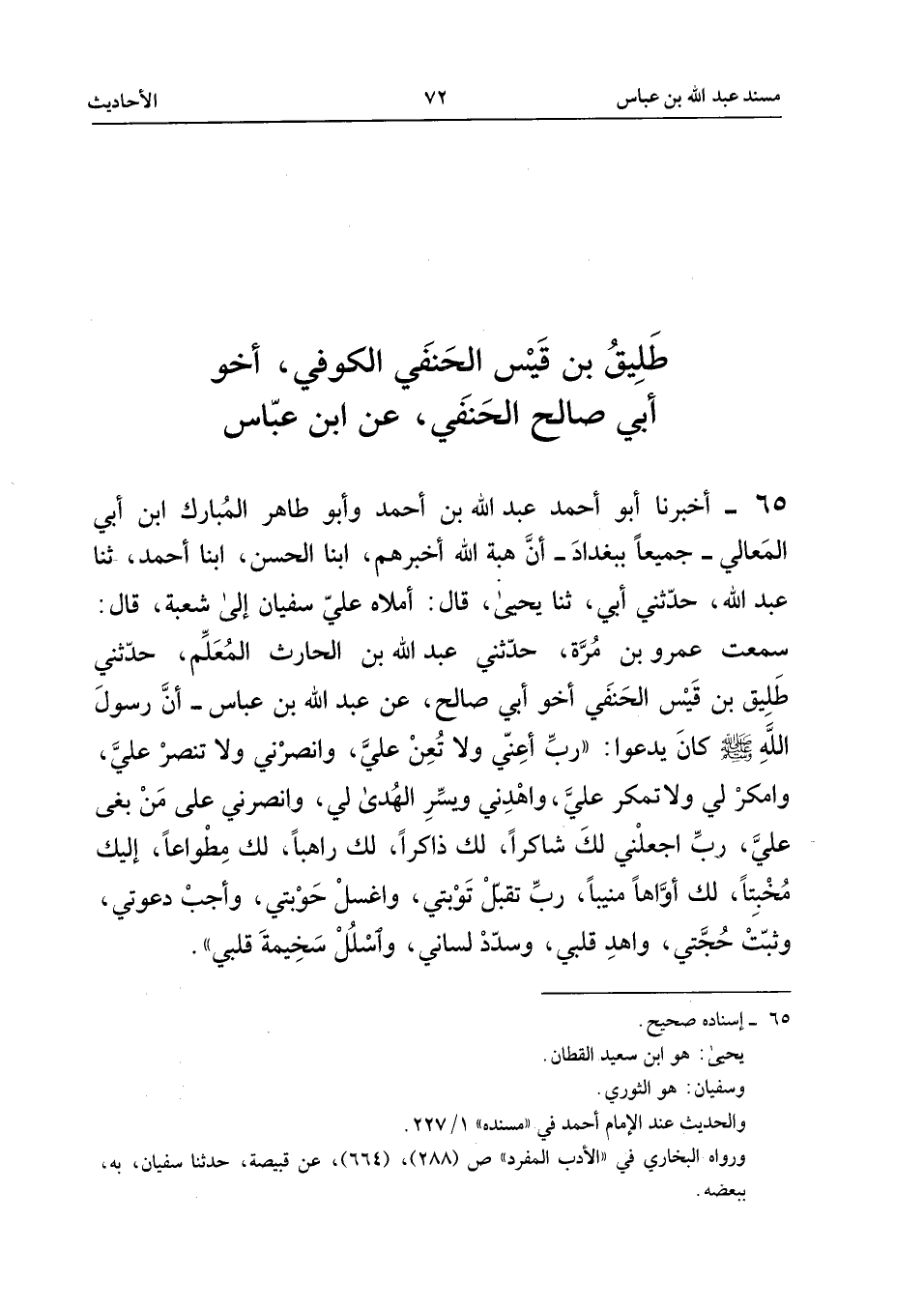 65 - أَخْبَرَنَا أُبو أَحْمَدَ عَبْدُ اللَّهِ بْنُ أَحْمَدَ، وَأَبُو طَاهِرٍ الْمُبَارَكُ بْنُ أَبِي الْمَعَالِي، جَمِيعًا بِبَغْدَادَ، أَنَّ هِبَةَ اللَّهِ أَخْبَرَهُمْ، أبنا الْحَسَنُ، أبنا أَحْمَدُ، ثَنَا عَبْدُ اللَّهِ، حَدَّثَنِي أَبِي، ثَنَا يَحْيَى، قَالَ: أَمْلاهُ عَلَيَّ سُفْيَانُ إِلَى شُعْبَةَ، قَالَ: سَمِعْتُ عَمْرَو بْنَ مُرَّةَ، حَدَّثَنِي عَبْدُ اللَّهِ بْنُ الْحَارِثِ الْمُعَلِّمُ، حَدَّثَنِي طَلِيقُ بْنُ قَيْسٍ الْحَنَفِيُّ أَخُو أَبِي صَالِحٍ، عَنْ ابْن عَبَّاس، أَنَّ رَسُولَ اللَّهِ صَلَّى اللَّهُ عَلَيْهِ وَسَلَّمَ كَانَ يَدْعُو: «رَبِّ أَعِنِّي وَلا تُعِنْ عَلَيَّ، وَانْصُرْنِي وَلا تَنْصُرْ عَلَيَّ، وَامْكُرْ لِي وَلا تَمْكُرْ عَلَيَّ، وَاهْدِنِي وَيَسِّرِ الْهُدَى لِي، وَانْصُرْنِي عَلَى مَنْ بَغَى عَلَيَّ، رَبِّ اجْعَلْنِي لَكَ شَاكِرًا، لَكَ ذَاكِرًا، لَكَ رَاهِبًا، لَكَ مِطْوَاعًا، إِلَيْكَ مُخْبِتًا، لَكَ أَوَّاهًا مُنِيبًا، رَبِّ تَقَبَّلْ تَوْبَتِي، وَاغْسِلْ حَوْبَتِي، وَأَجِبْ دَعْوَتِي، وَثَبِتِّ حُجَّتِي، وَاهْدِ قَلْبِي، وَسَدِّدْ لِسَانِي، وَاسْلُلْ سَخِيمَةَ قَلْبِي»