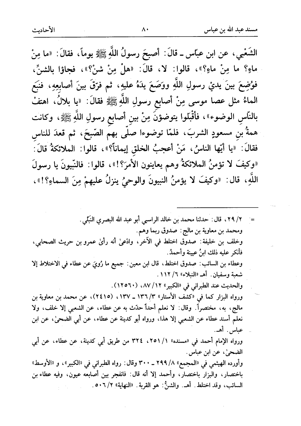 الشَّعْبِيِّ، عَنِ ابْن عَبَّاس، قَالَ: أَصْبَحَ رَسُولُ اللَّهِ صَلَّى اللَّهُ عَلَيْهِ وَسَلَّمَ يَوْمًا، فَقَالَ: «مَا مِنْ مَاءٍ؟ مَا مِنْ مَاءٍ؟» ، قَالُوا: لَا، قَالَ: «هَلْ مِنْ شَنٍّ؟» ، فَجَاءُوا بِالشَّنِّ، فَوُضِعَ بَيْنَ يَدَيْ رَسُولِ اللَّهِ وَوَضَعَ يَدَهُ عَلَيْهِ، ثُمَّ فَرَّقَ بَيْنَ أَصَابِعِهِ، فَنَبَعَ الْمَاءُ مِثْلَ عَصَا مُوسَى مِنْ أَصَابِعِ رَسُولِ اللَّهِ صَلَّى اللَّهُ عَلَيْهِ وَسَلَّمَ فَقَالَ: «يَا بِلالُ، اهْتِفْ بِالنَّاسِ الْوُضُوءَ» ، فَأَقْبَلُوا يَتَوَضَّئُونَ مِنْ بَيْنِ أَصَابِعِ رَسُولِ اللَّهِ صَلَّى اللَّهُ عَلَيْهِ وَسَلَّمَ، وَكَانَتْ هِمَّةُ ابْنِ مَسْعُودٍ الشُّرْبَ، فَلَمَّا تَوَضَّئُوا صَلَّى بِهِمُ الصُّبْحَ، ثُمَّ قَعَدَ لِلنَّاسِ فَقَالَ: «يَأَيُّهَا النَّاسُ، مَنْ أَعْجَبُ الْخَلْقِ إِيمَانًا؟» قَالُوا: الْمَلائِكَةُ، قَالَ: «وَكَيْفَ لَا تُؤْمِنُ الْمَلائِكَةُ وَهُمْ يُعَايِنُونَ الأَمْرَ؟» قَالُوا: فَالنَّبِيُّونَ يَا رَسُولَ اللَّهِ، قَالَ: «وَكَيْفَ لَا يُؤْمِنُ النَّبِيُّونَ وَالْوَحْيُ يَنْزِلُ عَلَيْهِمْ مِنَ السَّمَاءِ؟ !»