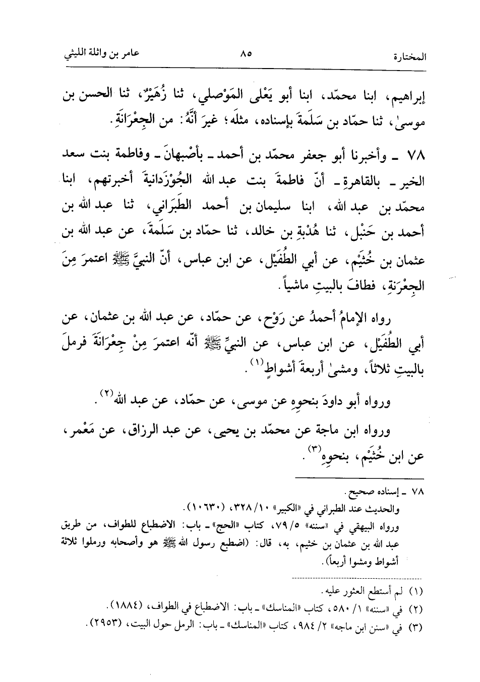 78 - وَأَخْبَرَنَا أَبُو جَعْفَرٍ مُحَمَّدُ بْنُ أَحْمَدَ، بِأَصْبَهَانَ، وَفَاطِمَةُ بِنْتُ سَعْدٍ الْخَيْرِ، بِالْقَاهِرَةِ، أَنَّ فَاطِمَةَ بِنْتَ عَبْدِ اللَّهِ الْجُوزْدَانِيَّةَ أَخْبَرَتْهُمْ، أبنا مُحَمَّدُ بْنُ عَبْدِ اللَّهِ، أبنا سُلَيْمَانُ بْنُ أَحْمَدَ الطَّبَرَانِيُّ، ثَنَا عَبْدُ اللَّهِ بْنُ أَحْمَدَ بْنِ حَنْبَلٍ، ثَنَا هُدْبَةُ بْنُ خَالِدٍ، ثَنَا حَمَّادُ بْنُ سَلَمَةَ، عَنْ عَبْدِ اللَّهِ بْنِ عُثْمَانَ بْنِ خُثَيْمٍ، عَنْ أَبِي الطُّفَيْلِ، عَنِ ابْن عَبَّاس، أَنَّ النَّبِيَّ صَلَّى اللَّهُ عَلَيْهِ وَسَلَّمَ اعْتَمَرَ مِنَ الْجِعْرَانَةِ، فَطَافَ بِالْبَيْتِ مَاشِيًا، رَوَاهُ الإِمَامُ أَحْمَدُ عَنْ رَوْحٍ، عَنْ حَمَّادٍ، عَنْ عَبْدِ اللَّهِ بْنِ عُثْمَانَ، عَنْ أَبِي الطُّفَيْلِ، عَنِ ابْن عَبَّاس، عَنِ النَّبِيِّ صَلَّى اللَّهُ عَلَيْهِ وَسَلَّمَ أَنَّهُ اعْتَمَرَ مِنْ جِعْرَانَةَ فَرَمَلَ بِالْبَيْتِ ثَلاثًا، وَمَشَى أَرْبَعَةَ أَشْوَاطٍ.