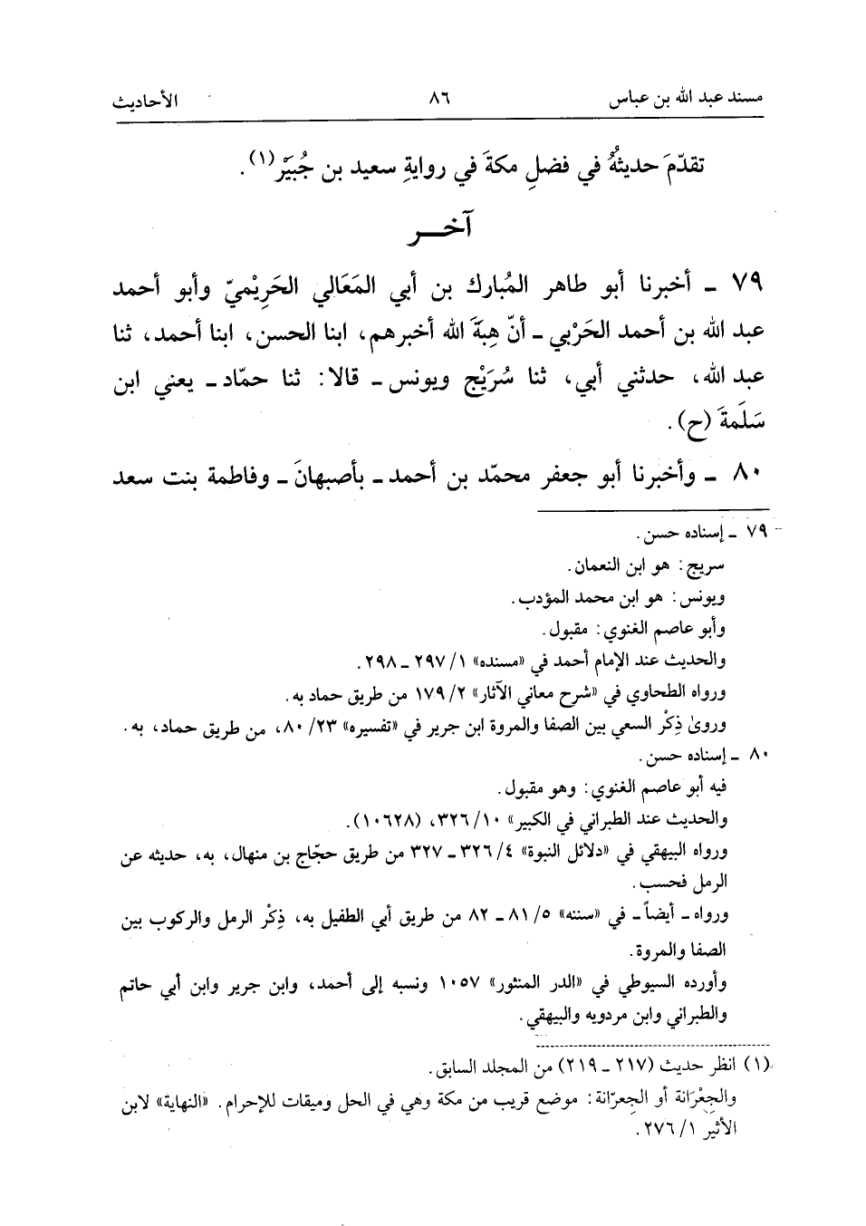 79 - أَخْبَرَنَا أَبُو طَاهِرٍ الْمُبَارَكُ بْنُ أَبِي الْمَعَالِي الْحَرِيمِيُّ، وَأَبُو أَحْمَدَ عَبْدُ اللَّهِ بْنُ أَحْمَدَ الْحَرْبِيُّ، أَنَّ هِبَةَ اللَّهِ أَخْبَرَهُمْ، أبنا الْحَسَنُ، أبنا أَحْمَدُ، ثَنَا عَبْدُ اللَّهِ، حَدَّثَنِي أَبِي، ثَنَا سُرَيْجٌ، وَيُونُسُ، قَالا: ثَنَا حَمَّادٌ، يَعْنِي ابْنَ سَلَمَةَ ح.