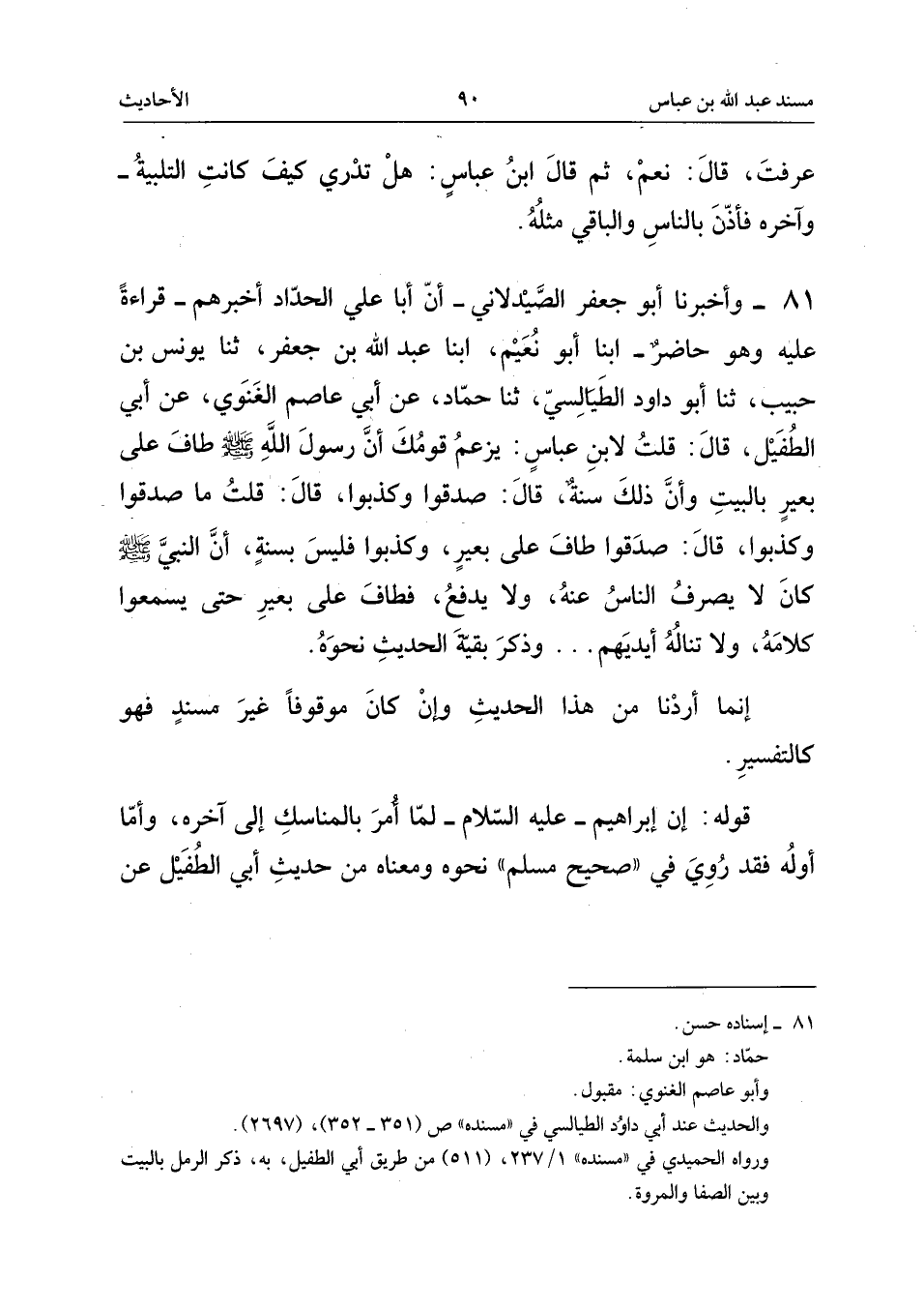 81 - وَأَخْبَرَنَا أَبُو جَعْفَرٍ الصَّيْدَلانِيُّ، أَنَّ أَبَا عَلِيٍّ الْحَدَّادَ أَخْبَرَهُمْ، قِرَاءَةً عَلَيْهِ وَهُوَ حَاضِرٌ، أبنا أَبُو نُعَيْمٍ، أبنا عَبْدُ اللَّهِ بْنُ جَعْفَرٍ، ثَنَا يُونُسُ بْنُ حَبِيبٍ، ثَنَا أَبُو دَاوُدَ الطَّيَالِسِيُّ، ثَنَا حَمَّادٌ، عَنْ أَبِي عَاصِمٍ الْغَنَوِيِّ، عَنْ أَبِي الطُّفَيْلِ، قَالَ: قُلْتُ لِابْنِ عَبَّاس: يَزْعُمُ قَوْمُكَ أَنَّ رَسُولَ اللَّهِ صَلَّى اللَّهُ عَلَيْهِ وَسَلَّمَ طَافَ عَلَى بَعِيرٍ بِالْبَيْتِ وَأَنَّ ذَلِكَ سُنَّةٌ، قَالَ: صَدَقُوا وَكَذَبُوا، قَالَ: قُلْتُ: مَا صَدَقُوا وَكَذَبُوا، قَالَ: صَدَقُوا، طَافَ عَلَى بَعِيرٍ، وَكَذَبُوا، فَلَيْسَ بِسُنَّةٍ، إِنَّ النَّبِيَّ صَلَّى اللَّهُ عَلَيْهِ وَسَلَّمَ كَانَ لَا يُصْرَفُ النَّاسُ عَنْهُ، وَلا يُدْفَعُ، فَطَافَ عَلَى بَعِيرٍ حَتَّى يَسْمَعُوا كَلامَهُ، وَلا تَنَالُهُ أَيْدِيهِمْ،. . . . . وَذَكَرَ بَقِيَّةَ الْحَدِيثِ نَحْوَهُ.