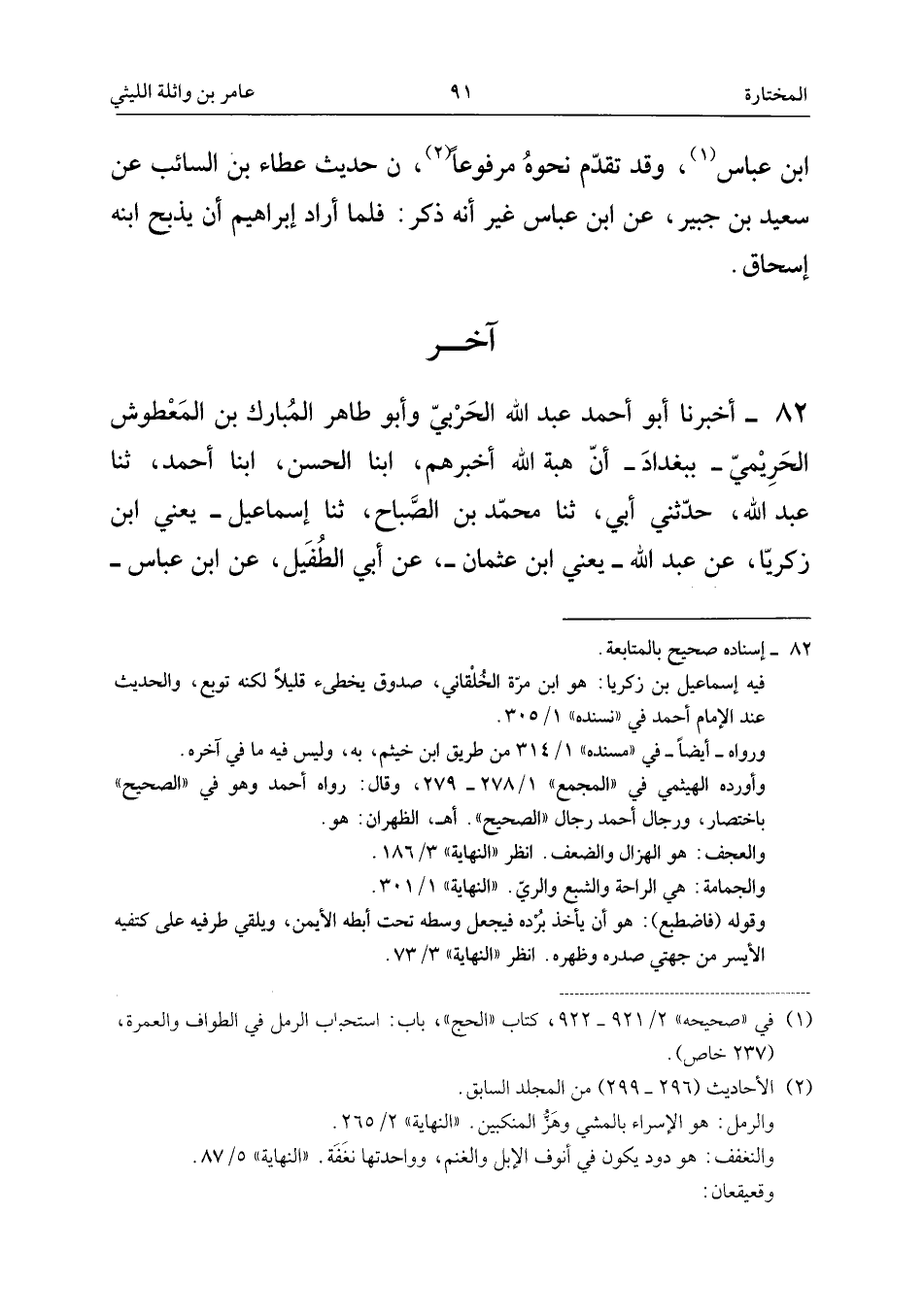 82 - أَخْبَرَنَا أَبُو أَحْمَدَ عَبْدُ اللَّهِ الْحَرْبِيُّ، وَأَبُو طَاهِرٍ الْمُبَارَكُ بْنُ الْمَعْطُوشِ الْحَرِيمِيُّ، بِبَغْدَادَ، أَنَّ هِبَةَ اللَّهِ أَخْبَرَهُمْ، أبنا الْحَسَنُ، أبنا أَحْمَدُ، ثَنَا عَبْدُ اللَّهِ، حَدَّثَنِي أَبِي، ثَنَا مُحَمَّدُ بْنُ الصَّبَّاحِ، ثَنَا إِسْمَاعِيلُ، يَعْنِي ابْنَ زَكَرِيَّا، عَنْ عَبْدِ اللَّهِ، يَعْنِي ابْنَ عُثْمَانَ، عَنْ أَبِي الطُّفَيْلِ، عَنِ ابْن عَبَّاس،