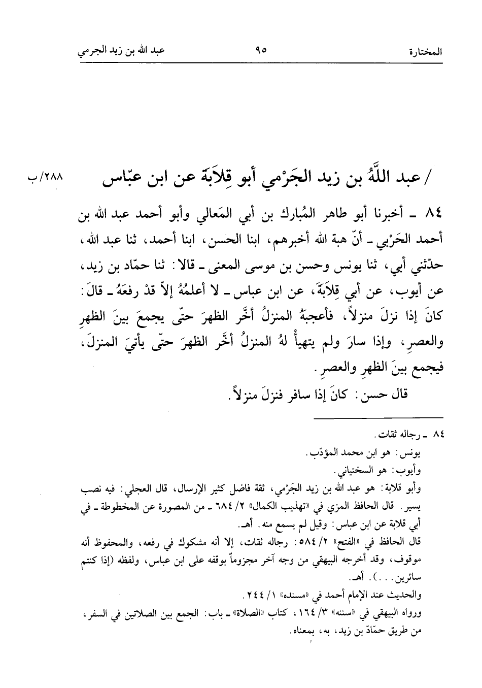 84 - أَخْبَرَنَا أَبُو طَاهِرٍ الْمُبَارَكُ بْنُ أَبِي الْمَعَالِي، وَأَبُو أَحْمَدَ عَبْدُ اللَّهِ بْنُ أَحْمَدَ الْحَرْبِيُّ، أَنَّ هِبَةَ اللَّهِ أَخْبَرَهُمْ، أبنا الْحَسَنُ، أبنا أَحْمَدُ، ثَنَا عَبْدُ اللَّهِ، حَدَّثَنِي أَبِي، ثَنَا يُونُسُ، وَحَسَنُ بْنُ مُوسَى الْمَعْنِيُّ، قَالا: ثَنَا حَمَّادُ بْنُ زَيْدٍ، عَنْ أَيُّوبَ، عَنْ أَبِي قِلابَةَ، عَنِ ابْن عَبَّاس، لَا أَعْلَمُهُ إِلا قَدْ رَفَعَهُ، قَالَ: كَانَ إِذَا نَزَلَ مَنْزِلا، فَأَعْجَبَهُ الْمَنْزِلُ أَخَّرَ الظُّهْرِ حَتَّى يَجْمَعَ بَيْنَ الظُّهْرِ وَالْعَصْرِ، وَإِذَا سَارَ وَلَمْ يَتَهَيَّأْ لَهُ الْمَنْزِلُ أَخَّرَ الظُّهْرَ حَتَّى يَأْتِيَ الْمَنْزِلَ، فَيَجْمَعَ بَيْنَ الظُّهْرِ وَالْعَصْرِ.