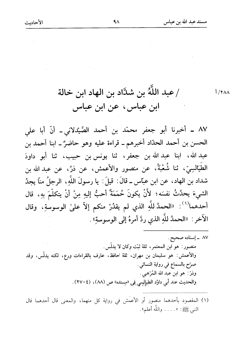 87 - أَخْبَرَنَا أَبُو جَعْفَرٍ مُحَمَّدُ بْنُ أَحْمَدَ الصَّيْدَلانِيُّ، أَنَّ أَبَا عَلِيٍّ الْحَسَنَ بْنَ أَحْمَدَ الْحَدَّادَ أَخْبَرَهُمْ، قِرَاءَةً عَلَيْهِ وَهُوَ حَاضِرٌ، أبنا أَحْمَدُ بْنُ عَبْدِ اللَّهِ، أبنا عَبْدُ اللَّهِ بْنُ جَعْفَرٍ، ثَنَا يُونُسُ بْنُ حَبِيبٍ، ثَنَا أَبُو دَاوُدَ الطَّيَالِسِيُّ، ثَنَا شُعْبَةُ، عَنْ مَنْصُورٍ، وَالأَعْمَشِ، عَنْ ذَرٍّ، عَنْ عَبْدِ اللَّهِ بْنِ شَدَّادِ بْنِ الْهَادِ، عَنِ ابْن عَبَّاس، قَالَ: قِيلَ: يَا رَسُولَ اللَّهِ، الرَّجُلُ مِنَّا يَجِدُ الشَّيْءَ يُحَدِّثُ نَفْسَهُ، لأَنْ يَكُونَ حُمَمَةٌ أَحَبَّ إِلَيْهِ مِنْ أَنْ يَتَكَلَّمَ بِهِ، قَالَ أَحَدُهُمَا: " الْحَمْدُ لِلَّهِ الَّذِي لَمْ يَقْدِرْ مِنْكُمْ إِلا عَلَى الْوَسْوَسَةِ، وَقَالَ الآخَرُ: «الْحَمْدُ لِلَّهِ الَّذِي رَدَّ أَمْرَهُ إِلَى الْوَسْوَسَةِ»
