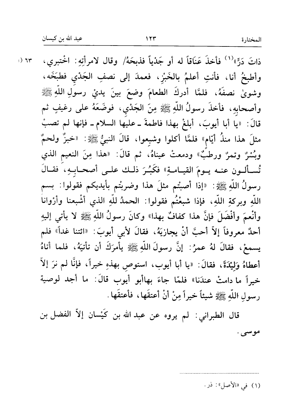 فَأَخَذ عَنَاقًا لَهُ، أَوْ جَدْيًا، فَذَبَحَهُ، وَقَالَ لامْرَأَتِهِ: اخْتَبِزِي وَأَطْبُخُ أَنَا، فَأَنْتِ أَعْلَمُ بِالْخُبْزِ، فَعَمَدَ إِلَى نِصْفِ الْجَدْيِ فَطَبَخَهُ، وَشَوَى نِصْفَهُ، فَلَمَّا أَدْرَكَ الطَّعَامَ وَضَعَ بَيْنَ يَدَيْ رَسُولِ اللَّهِ، صَلَّى اللَّهُ عَلَيْهِ وَسَلَّمَ، وَأَصْحَابِهِ، فَأَخَذَ رَسُولُ اللَّهِ، صَلَّى اللَّهُ عَلَيْهِ وَسَلَّمَ، مِنَ الْجَدْيِ، فَوَضَعَهُ عَلَى رَغِيفٍ، ثُمَّ قَالَ: " يَا أَبَا أَيُّوبَ، أَبْلِغْ بِهَذَا فَاطِمَةَ، عَلَيْهَا السَّلامُ، فَإِنَّهَا لَمْ تُصِبْ مِثْلَ هَذَا مُنْذُ أَيَّامٍ.