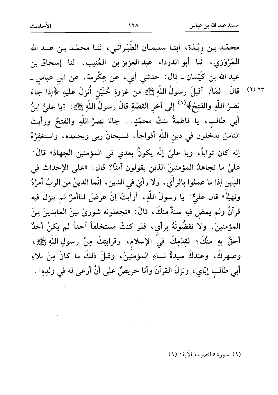 مُحَمَّدٌ ابْنُ رِيذَةَ، أنبا سُلَيْمَانُ بْنُ أَحْمَدَ الطَّبَرَانِيُّ، ثَنَا مُحَمَّدُ بْنُ عَبْدِ اللَّهِ الْمَرْوَزِيُّ، ثَنَا أَبُو الدَّرْدَاءِ عَبْدُ الْعَزِيزِ بْنُ الْمُنِيبِ، ثَنَا إِسْحَاقُ بْنُ عَبْدِ اللَّهِ بْنِ كَيْسَانَ، قَالَ: حَدَّثَنِي أَبِي، عَنْ عِكْرِمَةَ، عَنِ ابْنِ عَبَّاسٍ، قَالَ: لَمَّا أَقْبَلَ رَسُولُ اللَّهِ، صَلَّى اللَّهُ عَلَيْهِ وَسَلَّمَ، مِنْ غَزْوَةِ حُنَيْنٍ أُنْزِلَ عَلَيْهِ: {إِذَا جَاءَ نَصْرُ اللَّهِ وَالْفَتْحُ} [النَّصْر: 1] إِلَى آخِرِ الْقِصَّةِ، قَالَ رَسُولُ اللَّهِ، صَلَّى اللَّهُ عَلَيْهِ وَسَلَّمَ: " يَا عَلِيُّ بْنُ أَبِي طَالِبٍ، يَا فَاطِمَةُ بِنْتُ مُحَمَّدٍ. . . جَاءَ نَصْرُ اللَّهِ وَالْفَتْحُ، وَرَأَيْتُ النَّاسَ يَدْخُلُونَ فِي دِينِ اللَّهِ أَفْوَاجًا، فَسُبْحَانَ رَبِّي وَبِحَمْدِهِ، وَأَسْتَغْفِرُهُ إِنَّهُ كَانَ تَوَّابًا، وَيَا عَلِيُّ، إِنَّهُ يَكُونُ بَعْدِي فِي الْمُؤْمِنِينَ الْجِهَادُ.