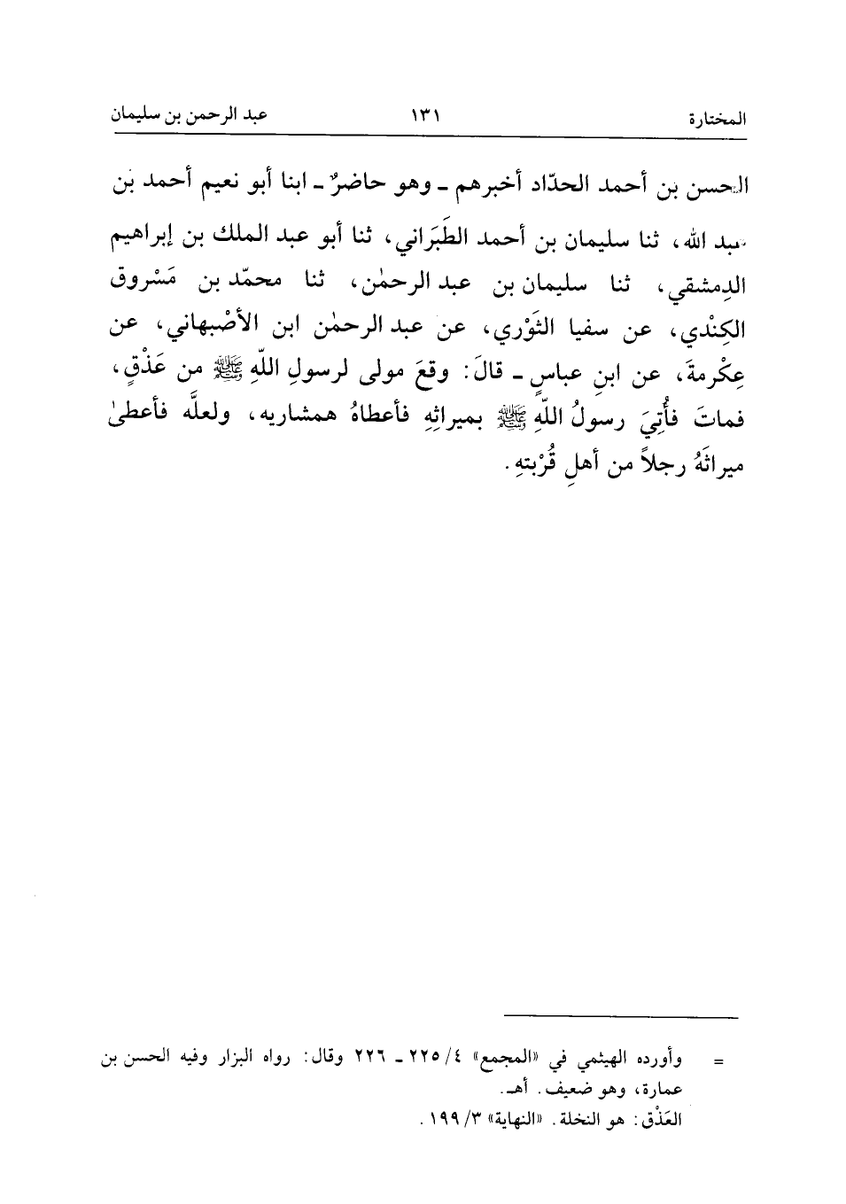 الْحَسَنَ بْنَ أَحْمَدَ الْحَدَّادَ أَخْبَرَهُمْ، وَهُوَ حَاضِرٌ، أنبا أَبُو نُعَيْمٍ أَحْمَدُ بْنُ عَبْدِ اللَّهِ، ثَنَا سُلَيْمَانُ بْنُ أَحْمَدَ الطَّبَرَانِيُّ، ثَنَا أَبُو عَبْدِ الْمَلِكِ بْنُ إِبْرَاهِيمَ الدِّمَشْقِيُّ، ثَنَا سُلَيْمَانُ بْنُ عَبْدِ الرَّحْمَنِ، ثَنَا مُحَمَّدُ بْنُ مَسْرُوقٍ الْكِنْدِيُّ، عَنْ سُفْيَانَ الثَّوْرِيِّ، عَنْ عَبْدِ الرَّحْمَنِ ابْنِ الأَصْبَهَانِيِّ، عَنْ عِكْرِمَةَ، عَنِ ابْنِ عَبَّاسٍ، قَالَ: وَقَعَ مَوْلًى لِرَسُولِ اللَّهِ، صَلَّى اللَّهُ عَلَيْهِ وَسَلَّمَ، مِنْ عَذْقٍ، فَمَاتَ، فَأُتِيَ رَسُولُ اللَّهِ، صَلَّى اللَّهُ عَلَيْهِ وَسَلَّمَ، بِمِيرَاثِهِ، فَأَعْطَاهُ همشاريه وَلَعَلَّهُ فَأَعْطَى مِيرَاثَهُ رَجُلا مِنْ أَهْلِ قَرَابَتِهِ