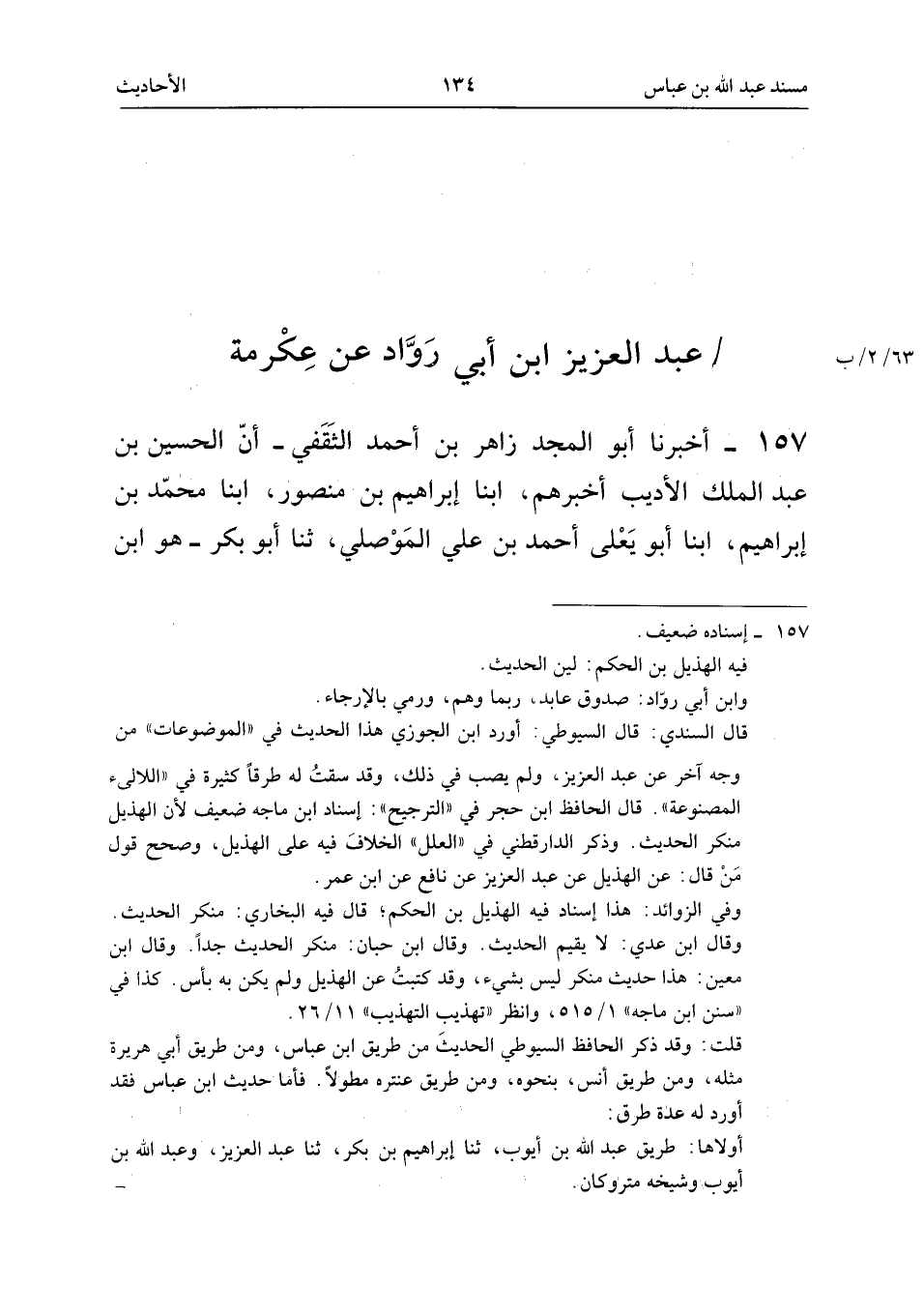 157 - أَخْبَرَنَا أَبُو الْمَجْدِ زَاهِرُ بْنُ أَحْمَدَ الثَّقَفِيُّ، أَنَّ الْحُسَيْنَ بْنَ عَبْدِ الْمَلِكِ الأَدِيبَ أَخْبَرَهُمْ، أنبا إِبْرَاهِيمُ بْنُ مَنْصُورٍ، أنبا مُحَمَّدُ بْنُ إِبْرَاهِيمَ، أنبا أَبُو يَعْلَى أَحْمَدُ بْنُ عَلِيٍّ الْمَوْصِلِيُّ، ثَنَا أَبُو بَكْرٍ، هُوَ ابْنُ