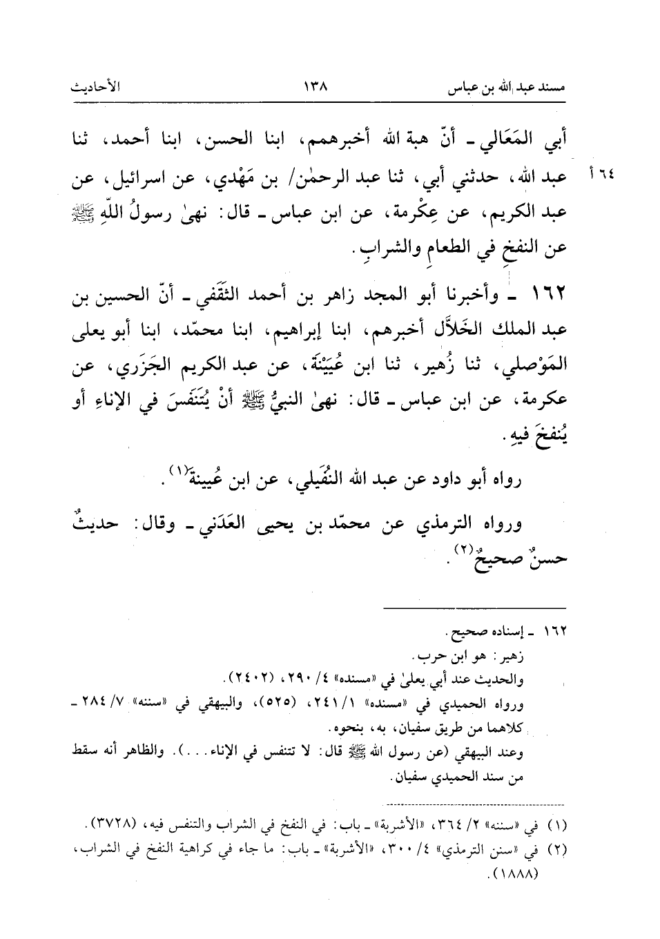 162 - وَأَخْبَرَنَا أَبُو الْمَجْدِ زَاهِرُ بْنُ أَحْمَدَ الثَّقَفِيُّ: أَنَّ الْحُسَيْنَ بْنَ عَبْدِ الْمَلِكِ الْخَلالَ أَخْبَرَهُمْ: أَنْبا إِبْرَاهِيمُ، أنبا مُحَمَّدٌ، أنبا أَبُو يَعْلَى الْمَوْصِلِيُّ، ثَنَا زُهَيْرٌ، ثَنَا ابْنُ عُيَيْنَةَ، عَنْ عَبْدِ الْكَرِيمِ الْجَزَرِيِّ، عَنْ عِكْرِمَةَ، عَنِ ابْنِ عَبَّاسٍ، قَالَ: نَهَى النَّبِيُّ، صَلَّى اللَّهُ عَلَيْهِ وَسَلَّمَ، أَنْ يُتَنَفَّسَ فِي الإِنَاءِ، أَوْ يُنْفَخَ فِيهِ.