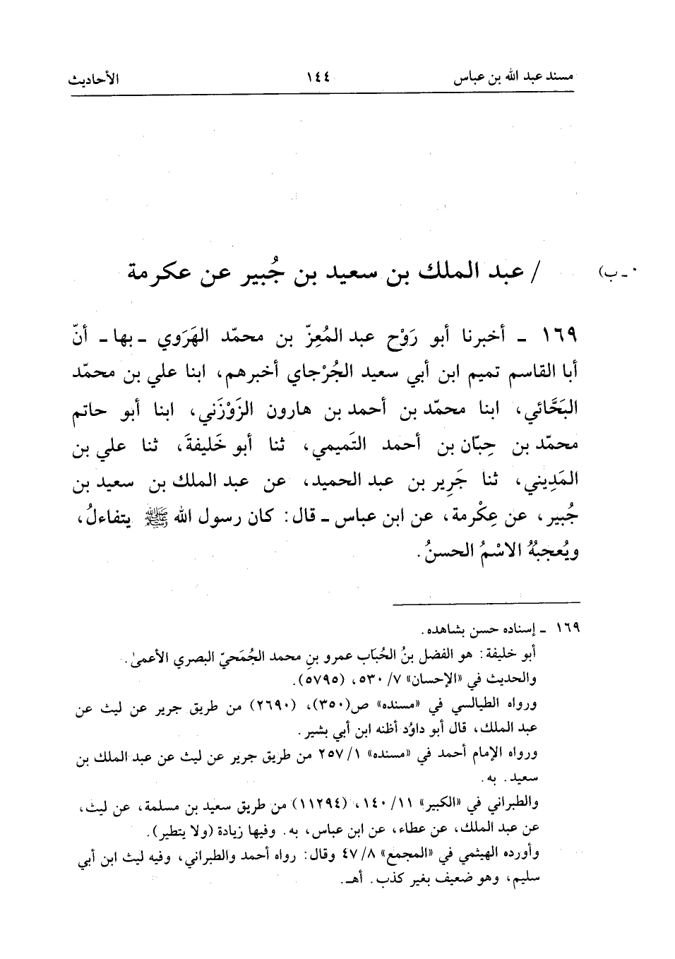169 - أَخْبَرَنَا أَبُو رَوْحٍ عَبْدُ الْمُعِزُّ بْنُ مُحَمَّدٍ الْهَرَوِيُّ، بِهَا، أَنَّ أَبَا الْقَاسِمِ تَمِيمًا ابْنَ أَبِي سَعِيدٍ الْجُرْجَانِيَّ أَخْبَرَهُمْ، أنبا عَلِيُّ بْنُ مُحَمَّدٍ البَحَّاثِيُّ، أنبا مُحَمَّدُ بْنُ أَحْمَدَ بْنِ هَارُونَ الزَّوْزَنِيُّ، أنبا أَبُو حَاتِمٍ مُحَمَّدُ بْنُ حِبَّانَ بْنِ أَحْمَدَ التَّمِيمِيُّ، ثَنَا أَبُو خَلِيفَةَ، ثَنَا عَلِيٌّ ابْنُ الْمَدِينِيِّ، ثَنَا جَرِيرُ بْنُ عَبْدِ الْحَمِيدِ، عَنْ عَبْدِ الْمَلِكِ بْنِ سَعِيدِ بْنِ جُبَيْرٍ، عَنْ عِكْرِمَةَ، عَنِ ابْنِ عَبَّاسٍ، قَالَ: كَانَ رَسُولُ اللَّهِ، صَلَّى اللَّهُ عَلَيْهِ وَسَلَّمَ، يَتَفَاءَلُ، وَيُعْجِبُهُ الاسْمُ الْحَسَنُ.