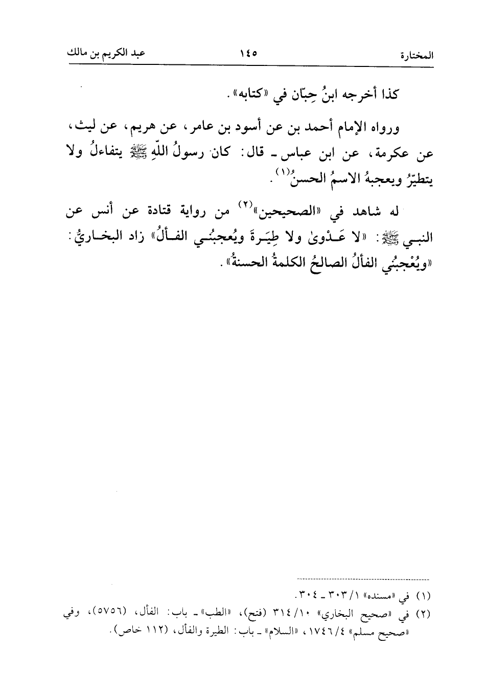وَرَوَاهُ الإِمَامُ أَحْمَدُ، عَنْ أَسْوَدَ بْنِ عَامِرٍ، عَنْ هُرَيْمٍ، عَنْ لَيْثٍ، عَنْ عِكْرِمَةَ، عَنِ ابْنِ عَبَّاسٍ، قَالَ: كَانَ رَسُولُ اللَّهِ، صَلَّى اللَّهُ عَلَيْهِ وَسَلَّمَ، يَتَفَاءَلُ وَلا يَتَطَيَّرُ، وَيُعْجِبُهُ الاسْمُ الْحَسَنُ.