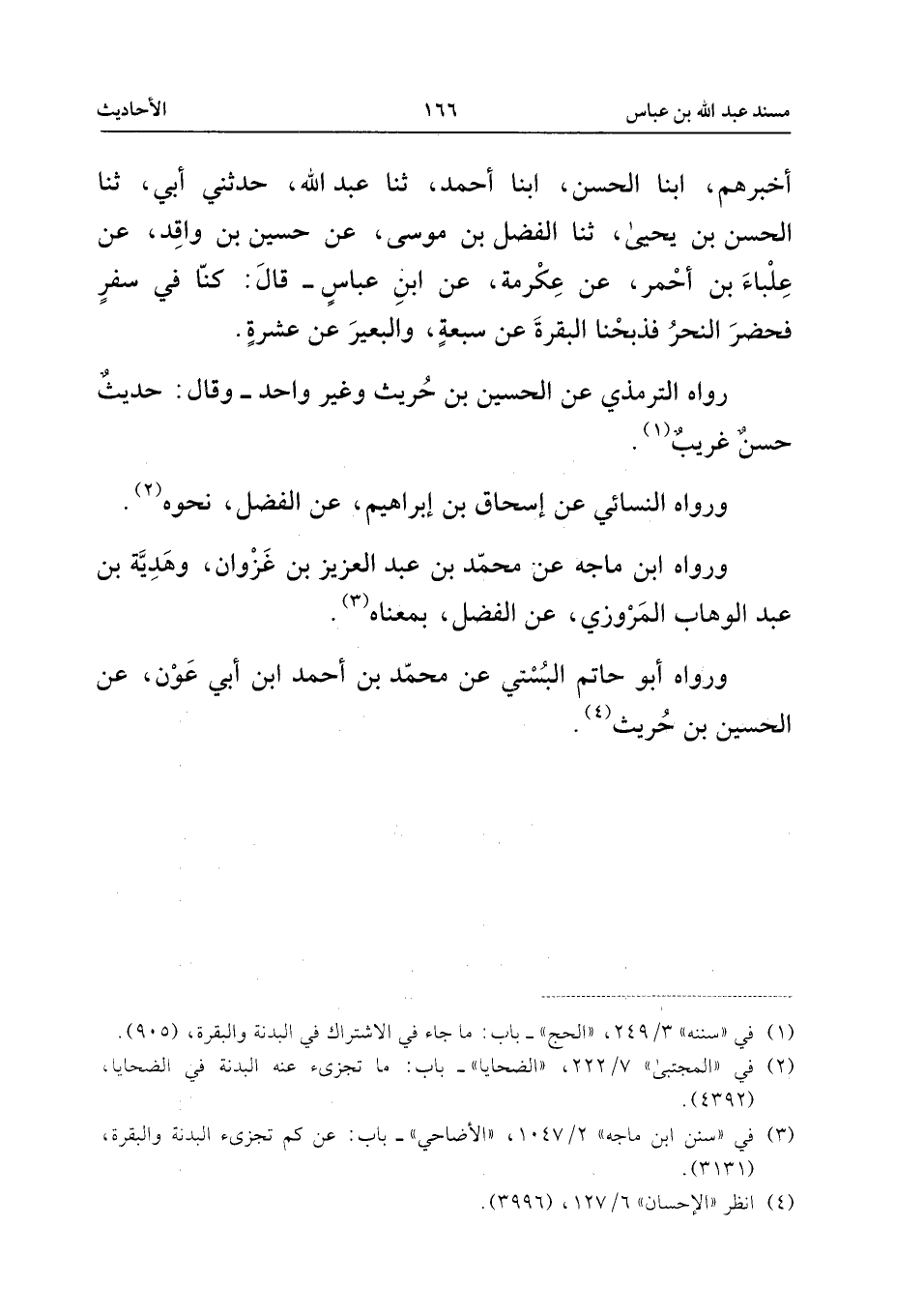 أَخْبَرَهُمْ، أنبا الْحَسَنُ، أنبا أَحْمَدُ، ثَنَا عَبْدُ اللَّهِ، حَدَّثَنِي أَبِي، ثَنَا الْحَسَنُ بْنُ يَحْيَى، ثَنَا الْفَضْلُ بْنُ مُوسَى، عَنْ حُسَيْنِ بْنِ وَاقِدٍ، عَنْ عِلْبَاءَ بْنِ أَحْمَرَ، عَنْ عِكْرِمَةَ، عَنِ ابْنِ عَبَّاسٍ، قَالَ: كُنَّا فِي سَفَرٍ، فَحَضَرَ النَّحْرُ، فَذَبَحْنَا الْبَقْرَةَ عَنْ سَبْعَةٍ، وَالْبَعِيرَ عَنْ عَشَرَةٍ.
