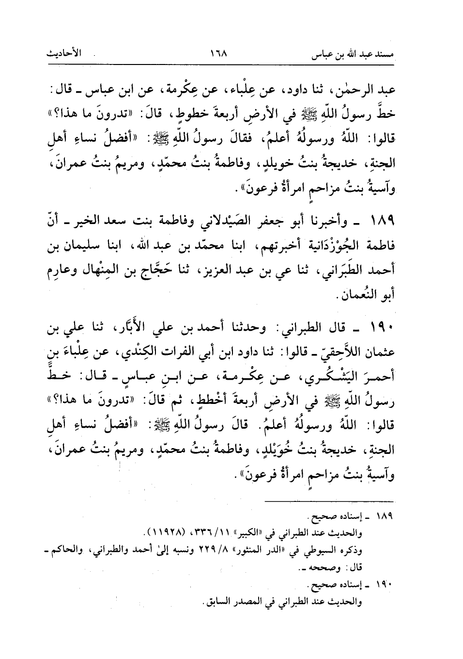 عَبْدِ الرَّحْمَنِ، ثَنَا دَاوُدُ، عَنْ عِلْبَاءَ، عَنْ عِكْرِمَةَ، عَنِ ابْنِ عَبَّاسٍ: قَالَ خَطَّ رَسُولُ اللَّهِ، صَلَّى اللَّهُ عَلَيْهِ وَسَلَّمَ، فِي الأَرْضِ أَرْبَعَةَ خُطُوطٍ، قَالَ: «تَدْرُونَ مَا هَذَا؟» قَالُوا: اللَّهُ وَرَسُولُهُ أَعْلَمُ، فَقَالَ رَسُولُ اللَّهِ، صَلَّى اللَّهُ عَلَيْهِ وَسَلَّمَ: «أَفْضَلُ نِسَاءِ أَهْلِ الْجَنَّةِ خَدِيجَةُ بِنْتُ خُوَيْلِدٍ، وَفَاطِمَةُ بِنْتُ مُحَمَّدٍ، وَمَرْيَمُ بِنْتُ عِمْرَانَ، وَآسِيَةُ بِنْتُ مُزَاحِمٍ امْرَأَةُ فِرْعَوْنَ»