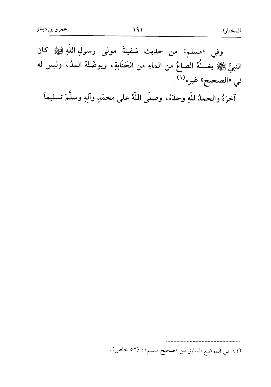 وَفِي مُسْلِمٍ مِنْ حَدِيثِ سَفِينَةَ مَوْلَى رَسُولِ اللَّهِ، صَلَّى اللَّهُ عَلَيْهِ وَسَلَّمَ، كَانَ النَّبِيُّ، صَلَّى اللَّهُ عَلَيْهِ وَسَلَّمَ، يَغْسِلُهُ الصَّاعُ مِنَ الْمَاءِ مِنَ الْجَنَابَةِ، وَيُوَضِّئُهُ الْمُدُّ، وَلَيْسَ لَهُ فِي الصَّحِيحِ غَيْرُهُ.