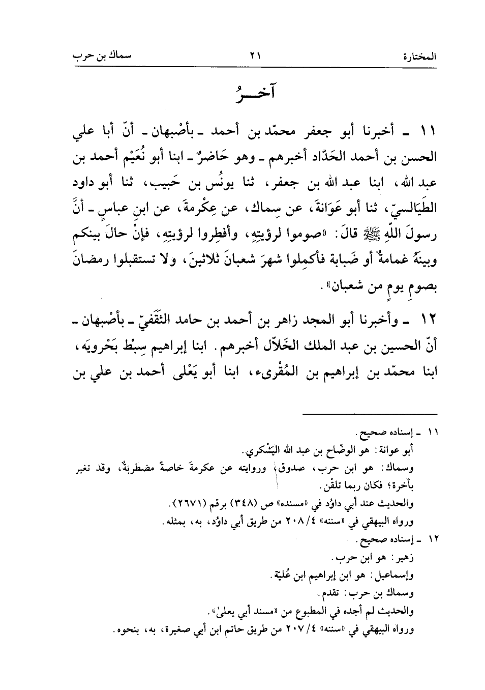 11 - أَخْبَرَنَا أَبُو جَعْفَرٍ مُحَمَّدُ بْنُ أَحْمَدَ بِأَصْبَهَانَ، أَنَّ أَبَا عَلِيٍّ الْحَسَنَ بْنَ أَحْمَدَ الْحَدَّادَ أَخْبَرَهُمْ، وَهُوَ حَاضِرٌ، أنبا أَبُو نُعَيْمٍ أَحْمَدُ بْنُ عَبْدِ اللَّهِ، أنبا عَبْدُ اللَّهِ بْنُ جَعْفَرٍ، ثَنَا يُونُسُ بْنُ حَبِيبٍ، ثَنَا أَبُو دَاوُدَ الطَّيَالِسِيُّ، ثَنَا أَبُو عَوَانَةَ، عَنْ سِمَاكٍ، عَنْ عِكْرِمَةَ، عَنِ ابْنِ عَبَّاسٍ، أَنَّ رَسُولَ اللَّهِ، صَلَّى اللَّهُ عَلَيْهِ وَسَلَّمَ، قَالَ: «صُومُوا لِرُؤْيَتِهِ، وَأَفْطِرُوا لِرُؤْيَتِهِ، فَإِنْ حَالَ بَيْنَكُمْ وَبَيْنَهُ غَمَامَةٌ، أَوْ ضَبَابَةٌ، فَأَكْمِلُوا شَهْرَ شَعْبَانَ ثَلاثِينَ، وَلا تَسْتَقْبِلُوا رَمَضَانَ بِصَوْمِ يَوْمٍ مِنْ شَعْبَانَ»