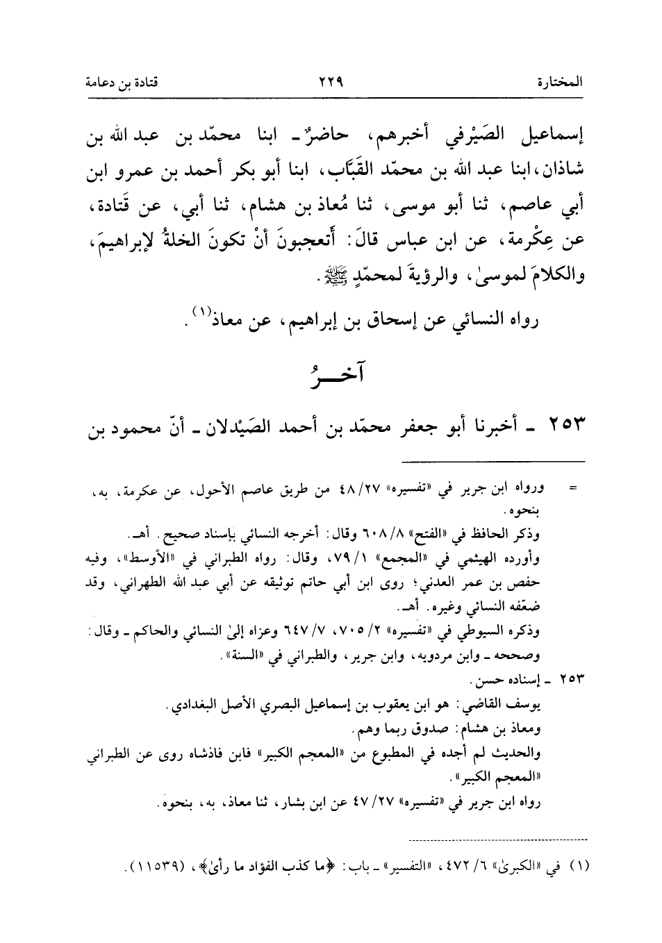 إِسْمَاعِيلَ الصَّيْرَفِيُّ أَخْبَرَهُمْ، وَهُوَ حَاضِرٌ، أنبا مُحَمَّدُ بْنُ عَبْدِ اللَّهِ بْنِ شَاذَانَ، أنبا عَبْدُ اللَّهِ بْنُ مُحَمَّدٍ الْقَبَّابُ، أنبا أَبُو بَكْرٍ أَحْمَدُ بْنُ عَمْرٍو ابْنُ أَبِي عَاصِمٍ، ثَنَا أَبُو مُوسَى، ثَنَا مُعَاذُ بْنُ هِشَامٍ، ثَنَا أَبِي، عَنْ قَتَادَةَ، عَنْ عِكْرِمَةَ، عَنِ ابْنِ عَبَّاسٍ، قَالَ: أَتَعْجَبُونَ أَنْ تَكُونَ الْخُلَّةُ لإِبْرَاهِيمَ، وَالْكَلامُ لِمُوسَى، وَالرُّؤْيَةُ لِمُحَمَّدٍ، صَلَّى اللَّهُ عَلَيْهِ وَسَلَّمَ.
