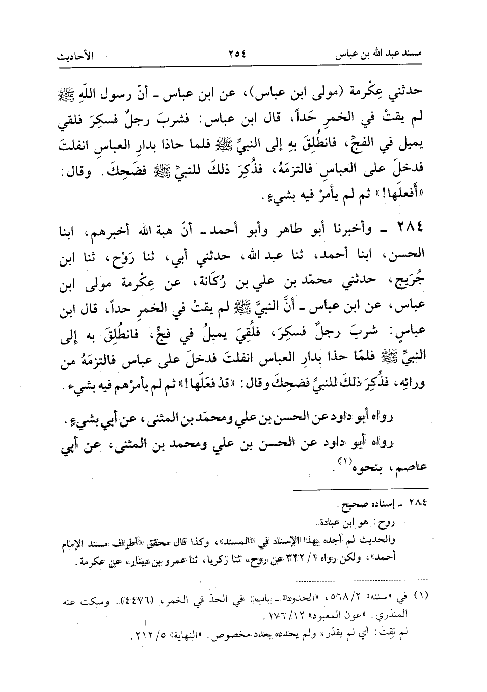 284 - وَأَخْبَرَنَا أَبُو طَاهِرٍ، وَأَبُو أَحْمَدَ، أَنَّ هِبَةَ اللَّهِ أَخْبَرَهُمْ، أنبا الْحَسَنُ، أنبا أَحْمَدُ، ثَنَا عَبْدُ اللَّهِ، حَدَّثَنِي أَبِي، ثَنَا رَوْحٌ، ثَنَا ابْنُ جُرَيْجٍ، حَدَّثَنِي مُحَمَّدُ بْنُ عَلِيِّ بْنِ رُكَانَةَ، عَنْ عِكْرِمَةَ، مَوْلَى ابْنِ عَبَّاسٍ، عَنِ ابْنِ عَبَّاسٍ، أَنَّ النَّبِيَّ، صَلَّى اللَّهُ عَلَيْهِ وَسَلَّمَ، لَمْ يَقِتْ فِي الْخَمْرِ حَدًّا، قَالَ ابْنُ عَبَّاسٍ: شَرِبَ رَجُلٌ فَسَكِرَ، فَلُقِيَ يَمِيلُ فِي فَجٍّ، فَانْطُلِقَ بِهِ إِلَى النَّبِيِّ، صَلَّى اللَّهُ عَلَيْهِ وَسَلَّمَ، فَلَمَّا حَاذَى بِدَارِ الْعَبَّاسِ انْفَلَتَ، فَدَخَلَ عَلَى عَبَّاسٍ، فَالْتَزَمَهُ مِنْ وَرَائِهِ، فَذُكِرَ ذَلِكَ لِلنَّبِيِّ، صَلَّى اللَّهُ عَلَيْهِ وَسَلَّمَ، فَضَحِكَ، وَقَالَ: «قَدْ فَعَلَهَا؟» .