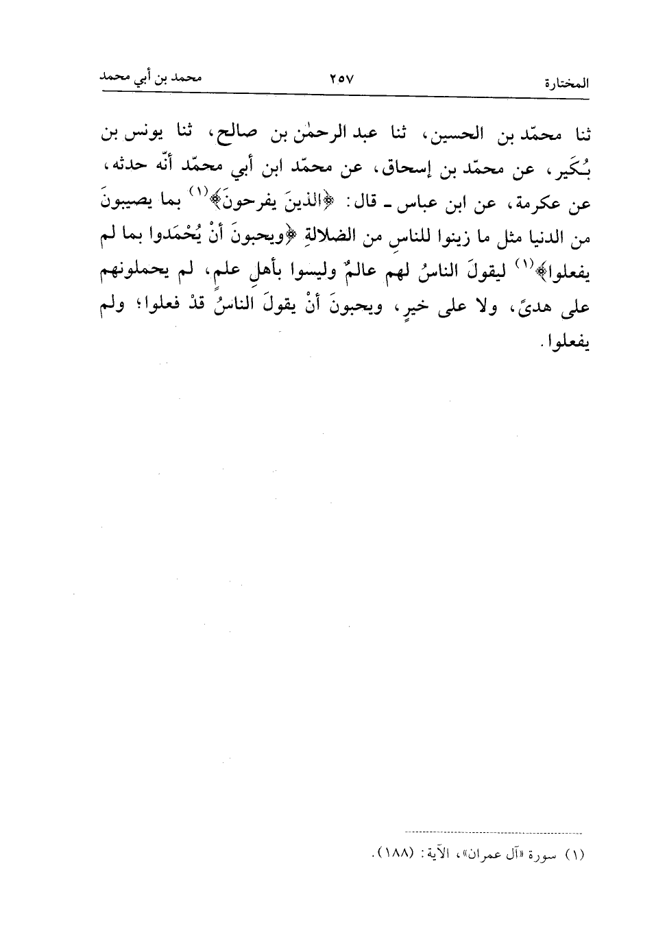 ثَنَا مُحَمَّدُ بْنُ الْحُسَيْنِ، ثَنَا عَبْدُ الرَّحْمَنِ بْنُ صَالِحٍ، ثَنَا يُونُسُ بْنُ بُكَيْرٍ، عَنْ مُحَمَّدِ بْنِ إِسْحَاقَ، عَنْ مُحَمَّدٍ ابْنِ أَبِي مُحَمَّدٍ أَنَّهُ حَدَّثَهُ، عَنْ عِكْرِمَةَ، عَنِ ابْنِ عَبَّاسٍ، قَالَ: {الَّذِينَ يَفْرَحُونَ} [آل عمرَان: 188] بِمَا يُصِيبُونَ مِنَ الدُّنْيَا مِثْلَ مَا زَيَّنُوا لِلنَّاسِ مِنَ الضَّلالَةِ: {وَيُحِبُّونَ أَنْ يُحْمَدُوا بِمَا لَمْ يَفْعَلُوا} [آل عمرَان: 188] لِيَقُولَ النَّاسُ لَهُمْ: عَالِمٌ، وَلَيْسُوا بِأَهْلِ عِلْمٍ، لَمْ يَحْمِلُوهُمْ عَلَى هُدًى، وَلا عَلَى خَيْرٍ، وَيُحِبُّونَ أَنْ يَقُولَ النَّاسُ: قَدْ فَعَلُوا، وَلَمْ يَفْعَلُوا