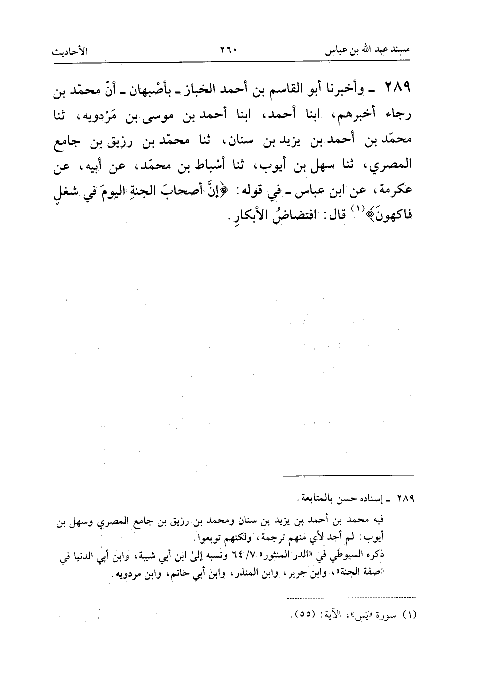 289 - وَأَخْبَرَنَا أَبُو الْقَاسِمِ بْنُ أَحْمَدَ الْخَبَّازُ، بِأَصْبَهَانَ، أَنَّ مُحَمَّدَ بْنَ رَجَاءٍ أَخْبَرَهُمْ، أنبا أَحْمَدُ، أنبا أَحْمَدُ بْنُ مُوسَى بْنِ مَرْدُوَيْهِ، ثَنَا مُحَمَّدُ بْنُ أَحْمَدَ بْنِ يَزِيدَ بْنِ سِنَانٍ، ثَنَا مُحَمَّدُ بْنُ رُزَيْقِ بْنِ جَامِعٍ الْمِصْرِيُّ، ثَنَا سَهْلُ بْنُ أَيُّوبَ، ثَنَا أَسْبَاطُ بْنُ مُحَمَّدٍ، عَنْ أَبِيهِ، عَنْ عِكْرِمَةَ، عَنِ ابْنِ عَبَّاسٍ، فِي قَوْلِهِ: {إِنَّ أَصْحَابَ الْجَنَّةِ الْيَوْمَ فِي شُغُلٍ فَاكِهُونَ} [يس: 55] ، قَالَ: افْتِضَاضِ الأَبْكَارِ