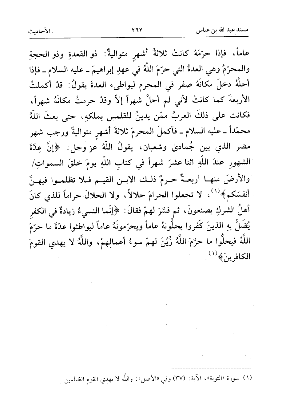 عَامًا، فَإِذَا حَرَّمَهُ كَانَتْ ثَلاثَةُ أَشْهُرٍ مُتَوَالِيَةٍ: ذُو الْقَعْدَةِ وَذُو الْحِجَّةِ وَالْمُحَرَّمُ، وَهِيَ الْعِدَّةُ الَّتِي حَرَّمَ اللَّهُ فِي عَهْدِ إِبْرَاهِيمَ، عَلَيْهِ السَّلامُ، فَإِذَا أَحَلَّهُ دَخَلَ مَكَانَهُ صَفَرٌ فِي الْمُحَرَّمِ لِيُوَاطِئَ الْعُدَّةَ، يَقُولُ: قَدْ أَكْمَلْتُ الأَرْبَعَةَ كَمَا كَانَتْ؛ لأَنِّي لَمْ أُحِلَّ شَهْرًا إِلا وَقَدْ حَرَّمْتُ مَكَانَهُ شَهْرًا، فَكَانَتْ عَلَى ذَلِكَ الْعَرَبُ مِمَّنْ يُدِينُ لِلْقَلَمَّسِ بِمُلْكِهِ، حَتَّى بَعَثَ اللَّهُ مُحَمَّدًا، عَلَيْهِ السَّلامُ، فَأَكْمَلَ الْمُحَرَّمَ ثَلاثَةَ أَشْهُرٍ مُتَوَالِيَةٍ، وَرَجَبُ شَهْرُ مُضَرَ الَّذِي بَيْنَ جُمَادَى وَشَعْبَانَ، يَقُولُ اللَّهِ، عَزَّ وَجَلَّ: {إِنَّ عِدَّةَ الشُّهُورِ عِنْدَ اللَّهِ اثْنَا عَشَرَ شَهْرًا فِي كِتَابِ اللَّهِ يَوْمَ خَلَقَ السَّمَوَاتِ وَالأَرْضَ مِنْهَا أَرْبَعَةٌ حُرُمٌ ذَلِكَ الدِّينُ الْقَيِّمُ فَلا تَظْلِمُوا فِيهِنَّ أَنْفُسَكُمْ} [التَّوْبَة: 36] لَا تَجْعَلُوا الْحَرَامَ حَلالا، وَلا الْحَلالَ حَرَامًا، لَلَّذِي كَانَ أَهْلُ الشِّرْكِ يَصْنَعُونَ، ثُمَّ فَسَّرَ لَهُمْ، فَقَالَ: {إِنَّمَا النَّسِيءُ زِيَادَةٌ فِي الْكُفْرِ يُضَلُّ بِهِ الَّذِينَ كَفَرُوا يُحِلُّونَهُ عَامًا وَيُحَرِّمُونَهُ عَامًا لِيُوَاطِئُوا عِدَّةَ مَا حَرَّمَ اللَّهُ فَيُحِلُّوا مَا حَرَّمَ اللَّهُ زُيِّنَ لَهُمْ سُوءُ أَعْمَالِهِمْ وَاللَّهُ لَا يَهْدِي الْقَوْمَ الْكَافِرِينَ} [التَّوْبَة: 37]