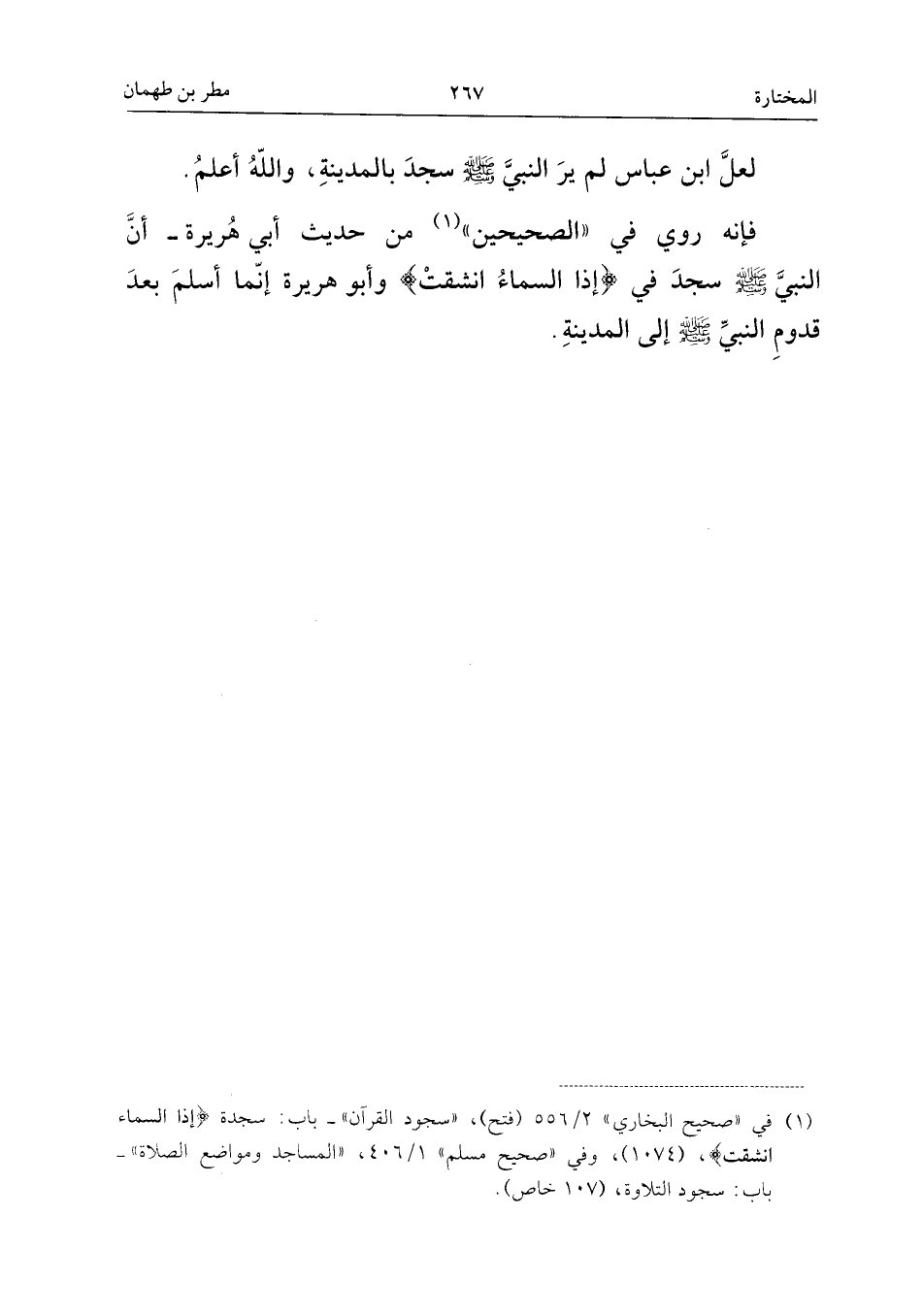 فَإِنَّهُ رُوِيَ فِي الصَّحِيحَيْنِ مِنْ حَدِيثِ أَبِي هُرَيْرَةَ، أَنَّ النَّبِيَّ، صَلَّى اللَّهُ عَلَيْهِ وَسَلَّمَ، سَجَدَ فِي إِذَا السَّمَاءُ انْشَقَّتْ، وَأَبُو هُرَيْرَةَ إِنَّمَا أَسْلَمَ بَعْدَ قُدُومِ النَّبِيِّ، صَلَّى اللَّهُ عَلَيْهِ وَسَلَّمَ، إِلَى الْمَدِينَةِ