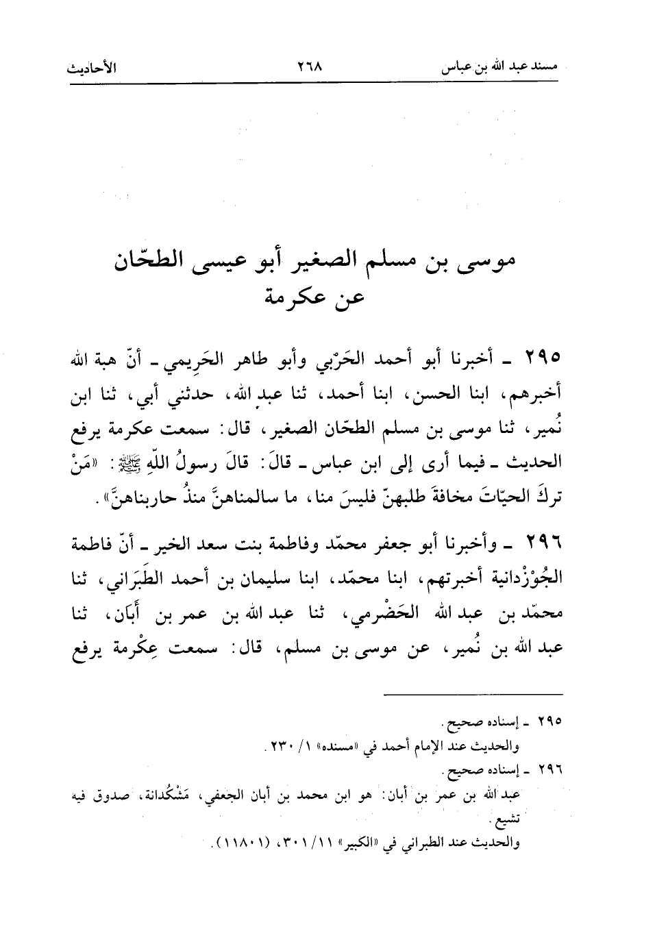 295 - أَخْبَرَنَا أَبُو أَحْمَدَ الْحَرْبِيُّ، وَأَبُو طَاهِرٍ الْحَرِيمِيُّ، أَنَّ هِبَةَ اللَّهِ أَخْبَرَهُمْ، أنبا الْحَسَنُ، أنبا أَحْمَدُ، ثَنَا عَبْدُ اللَّهِ، حَدَّثَنِي أَبِي، ثَنَا ابْنُ نُمَيْرٍ، ثَنَا مُوسَى بْنُ مُسْلِمٍ الطَّحَّانُ الصَّغِيرُ، قَالَ: سَمِعْتُ عِكْرِمَةَ يَرْفَعُ الْحَدِيثَ، فِيمَا أَرَى، إِلَى ابْنِ عَبَّاسٍ، قَالَ: قَالَ رَسُولُ اللَّهِ، صَلَّى اللَّهُ عَلَيْهِ وَسَلَّمَ: «مَنْ تَرَكَ الْحَيَّاتِ مَخَافَةَ طَلَبِهِنَّ فَلَيْسَ مِنَّا، مَا سَالَمْنَاهُنَّ مُنْذُ حَارَبْنَاهُنَّ»