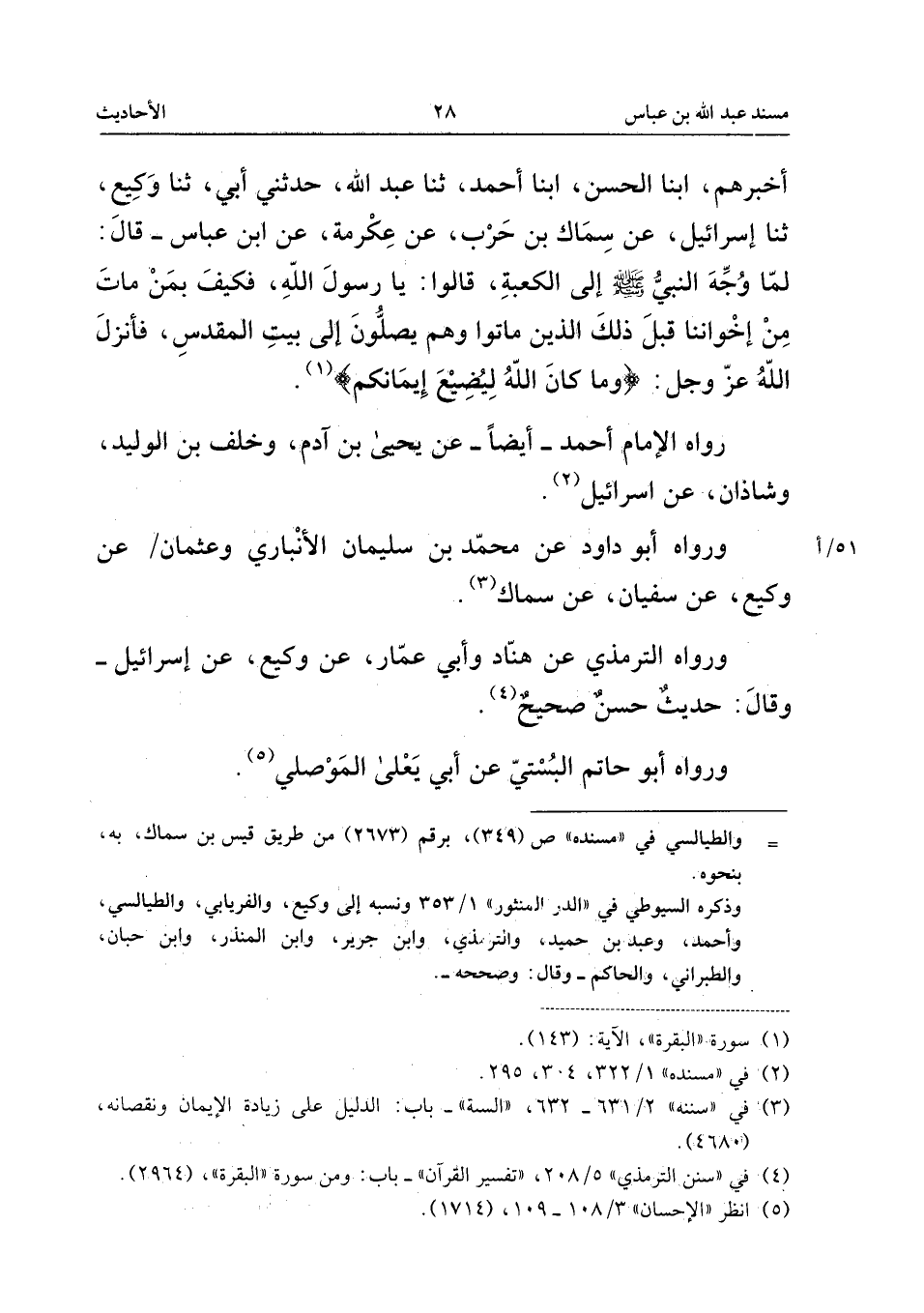 أَخْبَرَهُمْ، أنبا الْحَسَنُ، أنبا أَحْمَدُ، ثَنَا عَبْدُ اللَّهِ، حَدَّثَنِي أَبِي، ثَنَا وَكِيعٌ، ثَنَا إِسْرَائِيلُ، عَنْ سِمَاكِ بْنِ حَرْبٍ، عَنْ عِكْرِمَةَ، عَنِ ابْنِ عَبَّاسٍ، قَالَ: لَمَّا وُجِّهَ النَّبِيُّ، صَلَّى اللَّهُ عَلَيْهِ وَسَلَّمَ، إِلَى الْكَعْبَةِ، قَالُوا: يَا رَسُولَ اللَّهِ، فَكَيْفَ بِمَنْ مَاتَ مِنْ إِخْوَانِنَا قَبْلَ ذَلِكَ؛ الَّذِينَ مَاتُوا وَهُمْ يُصَلُّونَ إِلَى بَيْتِ الْمَقْدِسِ، فَأَنْزَلَ اللَّهُ، عَزَّ وَجَلَّ: {وَمَا كَانَ اللَّهُ لِيُضِيعَ إِيمَانَكُمْ} [الْبَقَرَة: 143] .