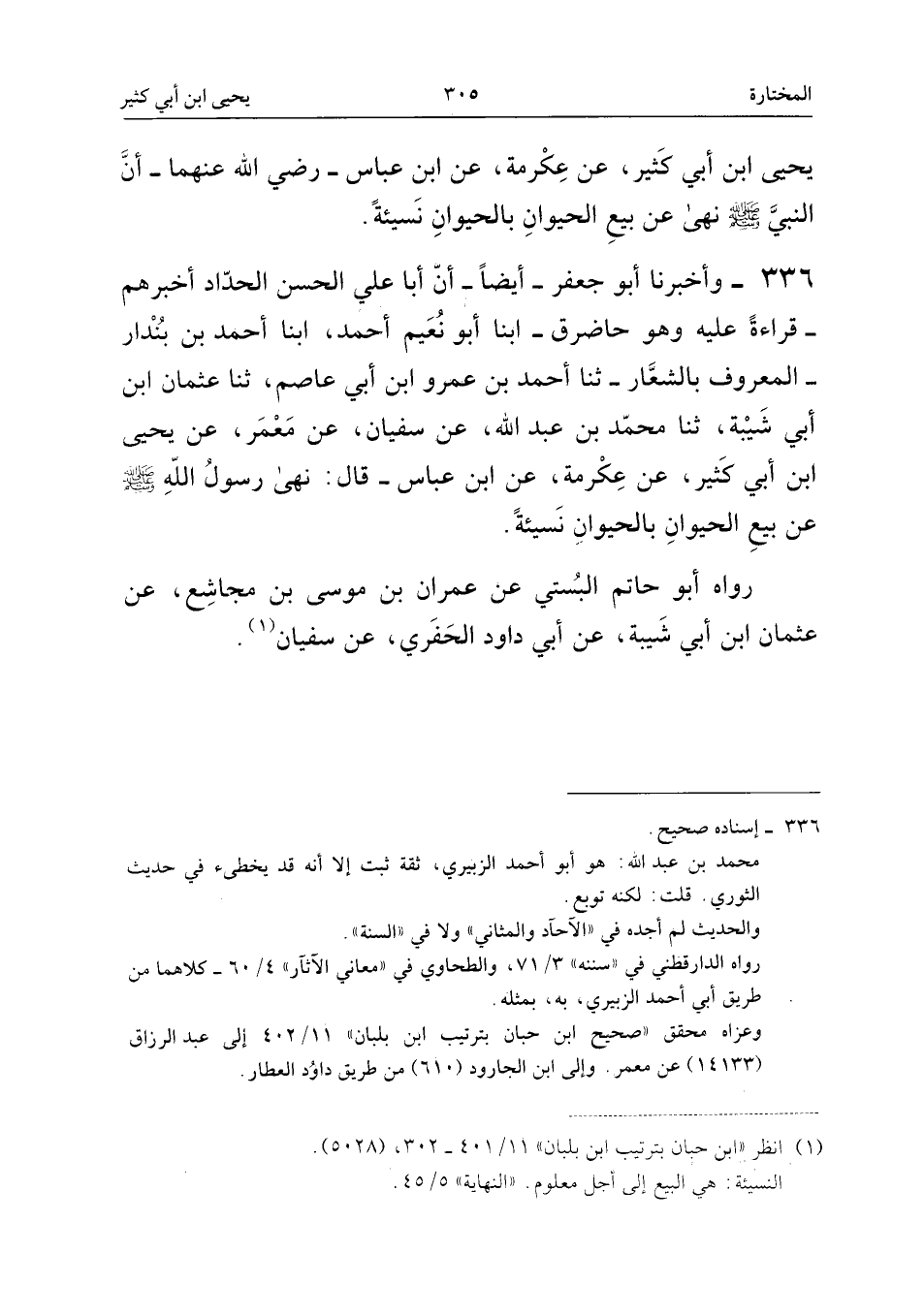 336 - وَأَخْبَرَنَا أَبُو جَعْفَرٍ، أَيْضًا، أَنَّ أَبَا عَلِيٍّ الْحَسَنَ الْحَدَّادَ أَخْبَرَهُمْ، قِرَاءَةً عَلَيْهِ وَهُوَ حَاضِرٌ، أنبا أَبُو نُعَيْمٍ أَحْمَدُ، أنبا أَحْمَدُ بْنُ بُنْدَارٍ، الْمَعْرُوفُ بِالشّعارِ، ثَنَا أَحْمَدُ بْنُ عَمْرٍو ابْنُ أَبِي عَاصِمٍ، ثَنَا عُثْمَانُ ابْنُ أَبِي شَيْبَةَ، ثَنَا مُحَمَّدُ بْنُ عَبْدِ اللَّهِ، عَنْ سُفْيَانَ، عَنْ مَعْمَرٍ، عَنْ يَحْيَى ابْنِ أَبِي كَثِيرٍ، عَنْ عِكْرِمَةَ، عَنِ ابْنِ عَبَّاسٍ، قَالَ: نَهَى رَسُولُ اللَّهِ، صَلَّى اللَّهُ عَلَيْهِ وَسَلَّمَ، عَنْ بَيْعِ الْحَيَوَانِ بِالْحَيَوَانِ نَسِيئَةً.