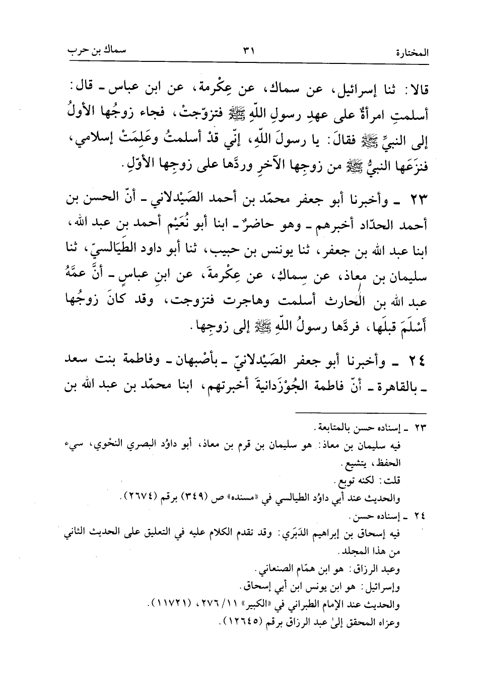 23 - وَأَخْبَرَنَا أَبُو جَعْفَرٍ مُحَمَّدُ بْنُ أَحْمَدَ الصَّيْدَلانِيُّ، أَنَّ الْحَسَنَ بْنَ أَحْمَدَ الْحَدَّادَ أَخْبَرَهُمْ، وَهُوَ حَاضِرٌ، أنبا أَبُو نُعَيْمٍ أَحْمَدُ بْنُ عَبْدِ اللَّهِ، أنبا عَبْدُ اللَّهِ بْنُ جَعْفَرٍ، ثَنَا يُونُسُ بْنُ حَبِيبٍ، ثَنَا أَبُو دَاوُدَ الطَّيَالِسِيُّ، ثَنَا سُلَيْمَانُ بْنُ مُعَاذٍ، عَنْ سِمَاكٍ، عَنْ عِكْرِمَةَ، عَنِ ابْنِ عَبَّاسٍ، أَنَّ عَمَّةَ عَبْدِ اللَّهِ بْنِ الْحَارِثِ أَسْلَمَتْ وَهَاجَرَتْ فَتَزَوَّجَتْ، وَقَدْ كَانَ زَوْجُهَا أَسْلَمَ قَبْلَهَا، فَرَدَّهَا رَسُولُ اللَّهِ، صَلَّى اللَّهُ عَلَيْهِ وَسَلَّمَ، إِلَى زَوْجِهَا