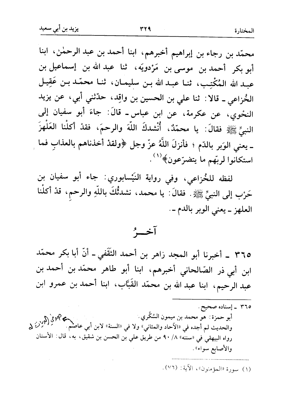 365 - أَخْبَرَنَا أَبُو الْمَجْدِ زَاهِرُ بْنُ أَحْمَدَ الثَّقَفِيُّ، أَنَّ أَبَا بَكْرٍ مُحَمَّدًا ابْنَ أَبِي ذَرٍّ الصَّالْحَانِيَّ أَخْبَرَهُمْ، أنبا أَبُو طَاهِرٍ مُحَمَّدُ بْنُ أَحْمَدَ بْنِ عَبْدِ الرَّحِيمِ، أنبا عَبْدُ اللَّهِ بْنُ مُحَمَّدٍ الْقَبَّابُ، أنبا أَحْمَدُ بْنُ عَمْرٍو ابْنُ