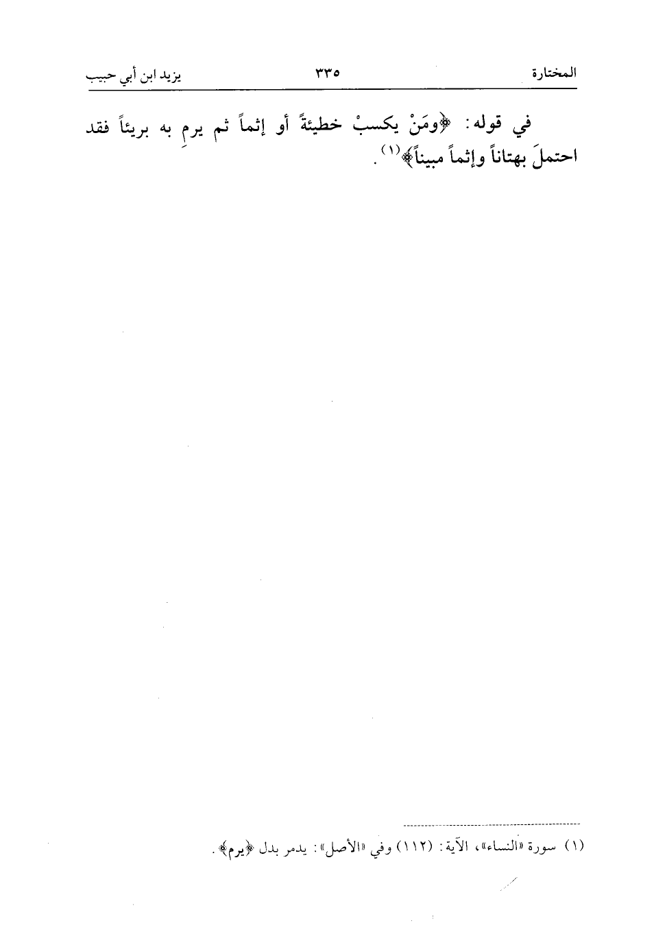 فِي قَوْلِهِ: {وَمَنْ يَكْسِبْ خَطِيئَةً أَوْ إِثْمًا ثُمَّ يَرْمِ بِهِ بَرِيئًا فَقَدِ احْتَمَلَ بُهْتَانًا وَإِثْمًا مُبِينًا} [النِّسَاء: 112]