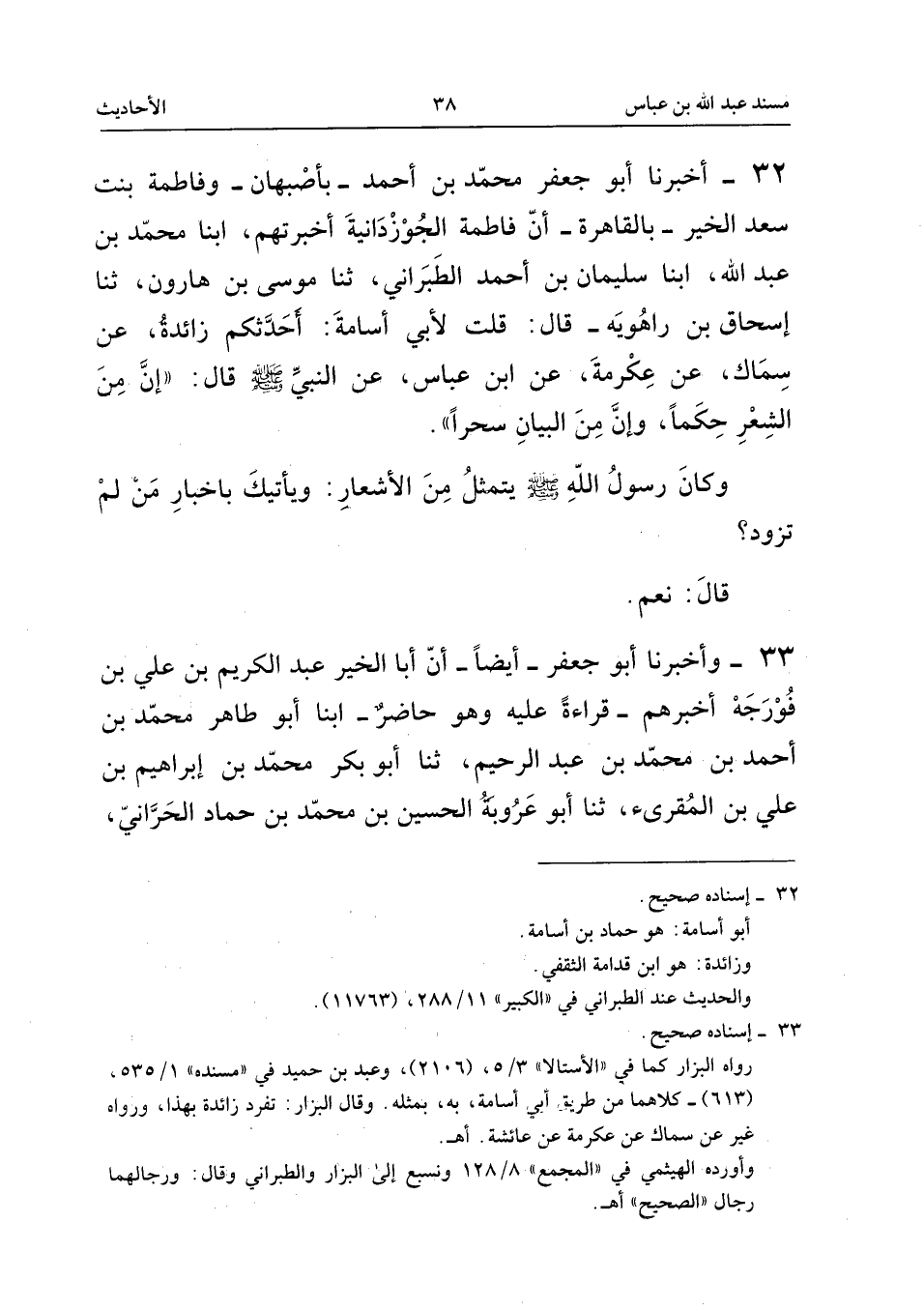 32 - أَخْبَرَنَا أَبُو جَعْفَرٍ مُحَمَّدُ بْنُ أَحْمَدَ، بِأَصْبَهَانَ، وَفَاطِمَةُ بِنْتُ سَعْدِ الْخَيْرِ، بِالْقَاهِرَةِ، أَنَّ فَاطِمَةَ الْجُوزْدَانِيَّةَ أَخْبَرَتْهُمْ، أنبا مُحَمَّدُ بْنُ عَبْدِ اللَّهِ، أنبا سُلَيْمَانُ بْنُ أَحْمَدَ الطَّبَرَانِيُّ، ثَنَا مُوسَى بْنُ هَارُونَ، ثَنَا إِسْحَاقُ بْنُ رَاهُوَيْهِ، قَالَ: قُلْتُ لأَبِي أُسَامَةَ: أَحَدَّثَكُمْ زَائِدَةُ، عَنْ سِمَاكٍ، عَنْ عِكْرِمَةَ، عَنِ ابْنِ عَبَّاسٍ، عَنِ النَّبِيِّ، صَلَّى اللَّهُ عَلَيْهِ وَسَلَّمَ، قَالَ: «إِنَّ مِنَ الشِّعْرِ حِكَمًا، وَإِنَّ مِنَ الْبَيَانِ سِحْرًا» .