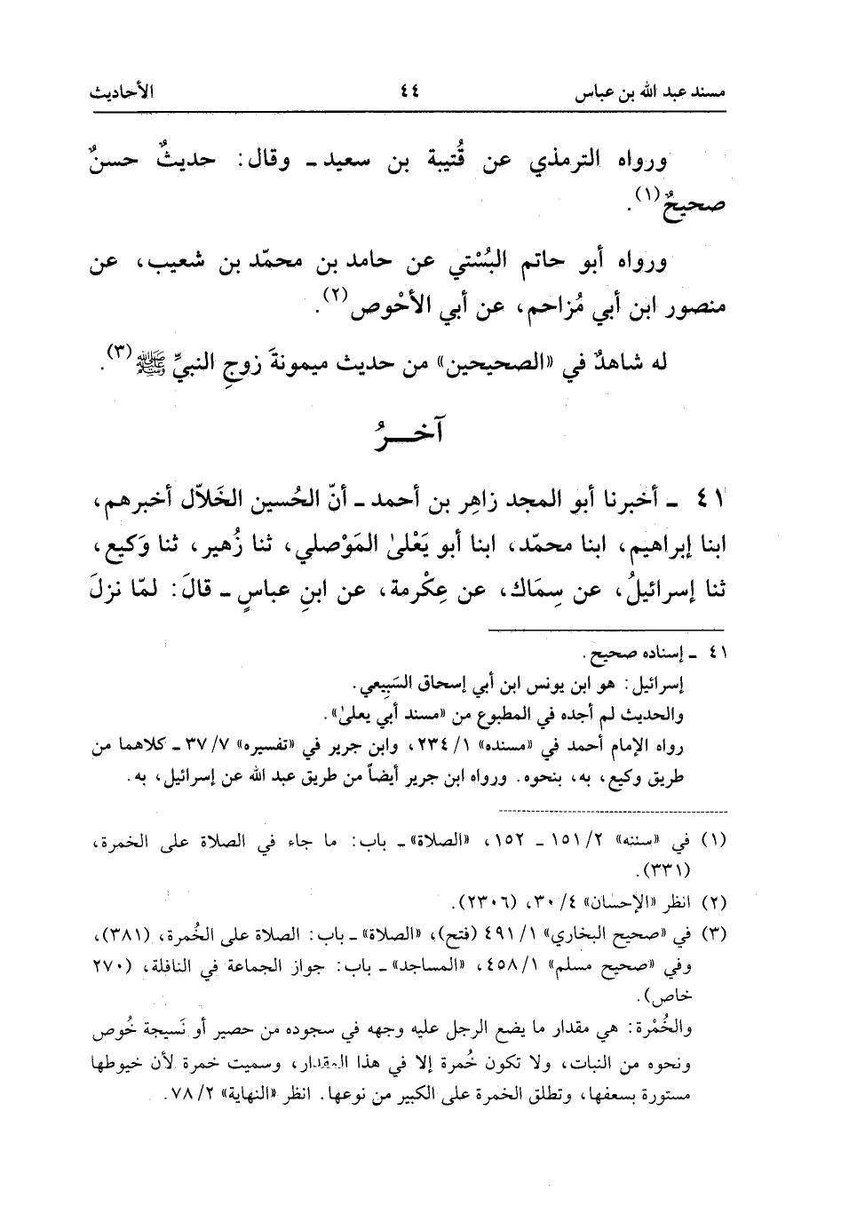 41 - أَخْبَرَنَا أَبُو الْمَجْدِ زَاهِرُ بْنُ أَحْمَدَ، أَنَّ الْحُسَيْنَ الْخَلالَ أَخْبَرَهُمْ، أنبا إِبْرَاهِيمُ، أنبا مُحَمَّدٌ، أنبا أَبُو يَعْلَى الْمَوْصِلِيُّ، ثَنَا زُهَيْرٌ، ثَنَا وَكِيعٌ، ثَنَا إِسْرَائِيلُ، عَنْ سِمَاكٍ، عَنْ عِكْرِمَةَ، عَنِ ابْنِ عَبَّاسٍ، قَالَ: لَمَّا نَزَلَ