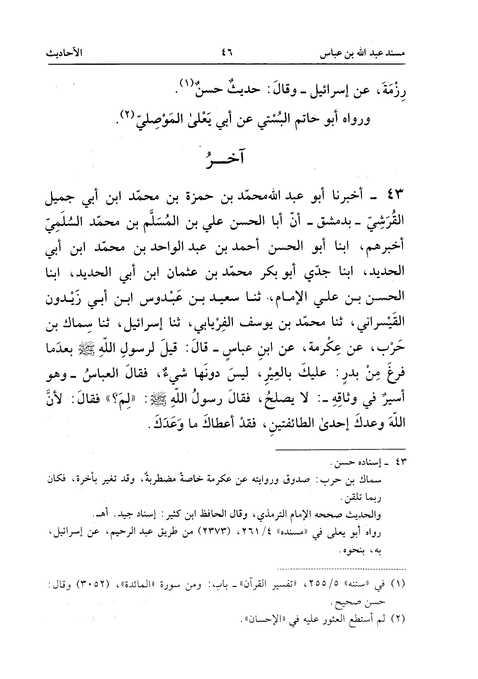 43 - أَخْبَرَنَا أَبُو عَبْدِ اللَّهِ مُحَمَّدُ بْنُ حَمْزَةَ بْنِ مُحَمَّدٍ ابْنُ أَبِي جَمِيلٍ الْقُرَشِيُّ، بِدِمَشْقَ، أَنَّ أَبَا الْحَسَنِ عَلِيَّ بْنَ الْمُسْلِمِ بْنِ مُحَمَّدٍ السُّلَمِيَّ أَخْبَرَهُمْ، أنبا أَبُو الْحَسَنِ أَحْمَدُ بْنُ عَبْدِ الْوَاحِدِ بْنِ مُحَمَّدٍ ابْنُ أَبِي الْحَدِيدِ، أنبا جَدِّي أَبُو بَكْرٍ مُحَمَّدُ بْنُ عُثْمَانَ ابْنُ أَبِي الْحَدِيدِ، أنبا الْحَسَنُ بْنُ عَلِيٍّ الإِمَامُ، ثَنَا سَعِيدُ بْنُ عَبْدُوسٍ ابْنُ أَبِي زَيْدُونٍ الْقَيْسَرَانِيُّ، ثَنَا مُحَمَّدُ بْنُ يُوسُفَ الْفِرْيَابِيُّ، ثَنَا إِسْرَائِيلُ، ثَنَا سِمَاكُ بْنُ حَرْبٍ، عَنْ عِكْرِمَةَ، عَنِ ابْنِ عَبَّاسٍ، قَالَ: قِيلَ لِرَسُولِ اللَّهِ، صَلَّى اللَّهُ عَلَيْهِ وَسَلَّمَ، بَعْدَ مَا فَرَغَ مِنْ بَدْرٍ: عَلَيْكَ بِالْعِيرِ، لَيْسَ دُونَهَا شَيْءٌ، فَقَالَ الْعَبَّاسُ، وَهُوَ أَسِيرٌ فِي وَثَاقِهِ: لَا يَصْلُحُ، فَقَالَ رَسُولُ اللَّهِ، صَلَّى اللَّهُ عَلَيْهِ وَسَلَّمَ: «لِمَ؟» فَقَالَ: لأَنَّ اللَّهَ وَعَدَكَ إِحْدَى الطَّائِفَتَيْنِ، فَقَدْ أَعْطَاكَ مَا وَعَدَكَ