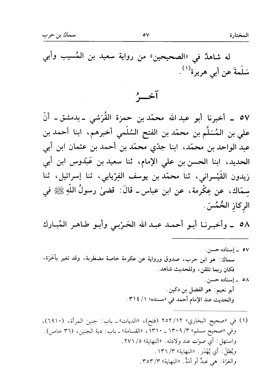 57 - وَأَخْبَرَنَا أَبُو عَبْدِ اللَّهِ مُحَمَّدُ بْنُ حَمْزَةَ الْقُرَشِيُّ، بِدِمَشْقَ، أَنَّ عَلِيَّ بْنَ الْمُسْلِمِ بْنِ مُحَمَّدِ بْنِ الْفَتْحِ السُّلَمِيَّ أَخْبَرَهُمْ، أنبا أَحْمَدُ بْنُ عَبْدِ الْوَاحِدِ بْنِ مُحَمَّدٍ، أنبا جَدِّي مُحَمَّدُ بْنُ أَحْمَدَ بْنِ عُثْمَانَ ابْنُ أَبِي الْحَدِيدِ، أنبا الْحَسَنُ بْنُ عَلِيٍّ الإِمَامُ، ثَنَا سَعِيدُ بْنُ عَبْدُوسٍ ابْنُ أَبِي زَيْدُونٍ الْقَيْسَرَانِيُّ، ثَنَا مُحَمَّدُ بْنُ يُوسُفَ الْفِرْيَابِيُّ، ثَنَا إِسْرَائِيلُ، ثَنَا سِمَاكٌ، عَنْ عِكْرِمَةَ، عَنِ ابْنِ عَبَّاسٍ، قَالَ: قَضَى رَسُولُ اللَّهِ، صَلَّى اللَّهُ عَلَيْهِ وَسَلَّمَ، فِي الرِّكَازِ: الْخُمُسَ