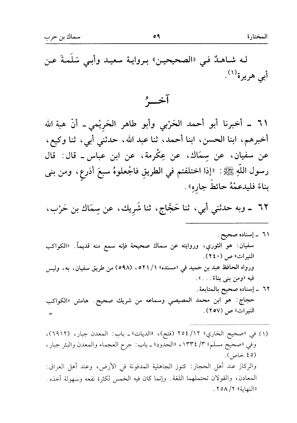 61 - أَخْبَرَنَا أَبُو أَحْمَدَ الْحَرْبِيُّ، وَأَبُو طَاهِرٍ الْحَرِيمِيُّ، أَنَّ هِبَةَ اللَّهِ أَخْبَرَهُمْ، أنبا الْحَسَنُ، أنبا أَحْمَدُ، ثَنَا عَبْدُ اللَّهِ، حَدَّثَنِي أَبِي، ثَنَا وَكِيعٌ، عَنْ سُفْيَانَ، عَنْ سِمَاكٍ، عَنْ عِكْرِمَةَ، عَنِ ابْنِ عَبَّاسٍ، قَالَ: قَالَ رَسُولُ اللَّهِ، صَلَّى اللَّهُ عَلَيْهِ وَسَلَّمَ: «إِذَا اخْتَلَفْتُمْ فِي الطَّرِيقِ فَاجْعَلُوهُ سَبْعَةَ أَذْرُعٍ، وَمَنْ بَنَى بِنَاءً فَلْيُدَعِّمْهُ حَائِطُ جَارِهِ»