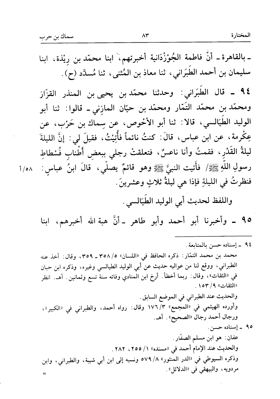 94 - قَالَ الطَّبَرَانِيُّ: وَحَدَّثَنَا مُحَمَّدُ بْنُ يَحْيَى بْنِ الْمُنْذِرِ، وَمُحَمَّدُ بْنُ مُحَمَّدٍ التَّمَّارُ، وَمُحَمَّدُ بْنُ حَيَّانَ الْمَازِنِيُّ، قَالُوا: ثَنَا أَبُو الْوَلِيدِ الطَّيَالِسِيُّ، قَالا: ثَنَا أَبُو الأَحْوَصِ، عَنْ سِمَاكِ بْنِ حَرْبٍ، عَنْ عِكْرِمَةَ، عَنِ ابْنِ عَبَّاسٍ، قَالَ: كُنْتُ نَائِمًا فَأُتِيتُ، فَقِيلَ لِي: لَيْلَةُ الْقَدْرِ، فَقُمْتُ وَأَنَا نَاعِسٌ، فَتَعَلَّقَتْ رِجْلَيَّ بِبَعْضِ أَطْنَابِ رَسُولِ اللَّهِ، صَلَّى اللَّهُ عَلَيْهِ وَسَلَّمَ، فَأَتَيْتُ النَّبِيَّ، صَلَّى اللَّهُ عَلَيْهِ وَسَلَّمَ، وَهُوَ قَائِمٌ يُصَلِّي، قَالَ ابْنُ عَبَّاسٍ: فَنَظَرْتُ فِي اللَّيْلَةِ، فَإِذَا هِيَ لَيْلَةُ ثَلاثٍ وَعِشْرِينَ.
